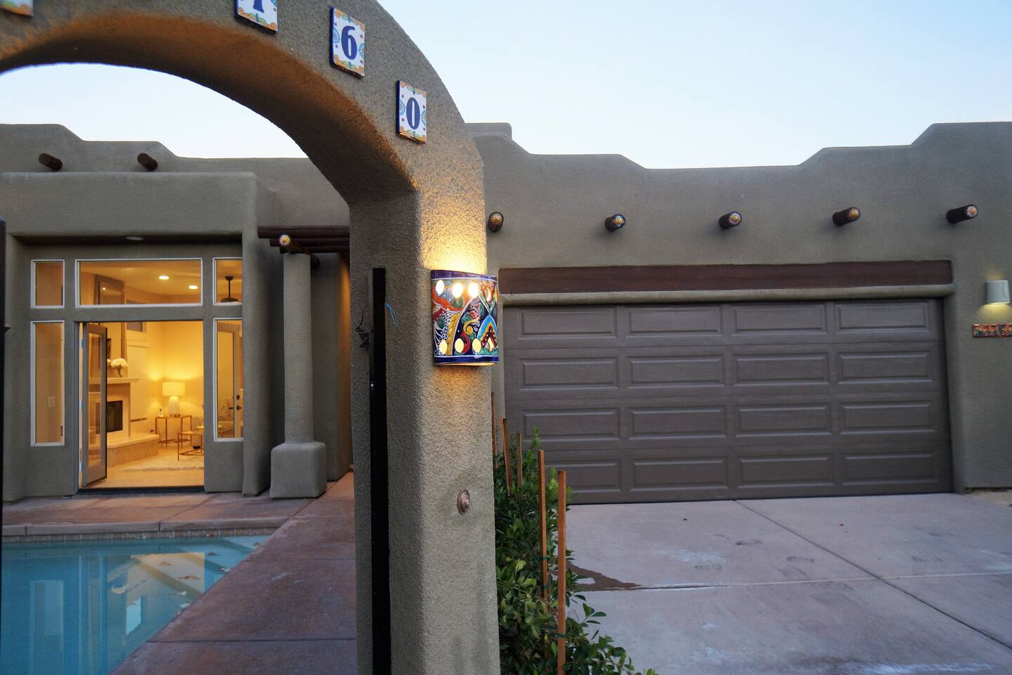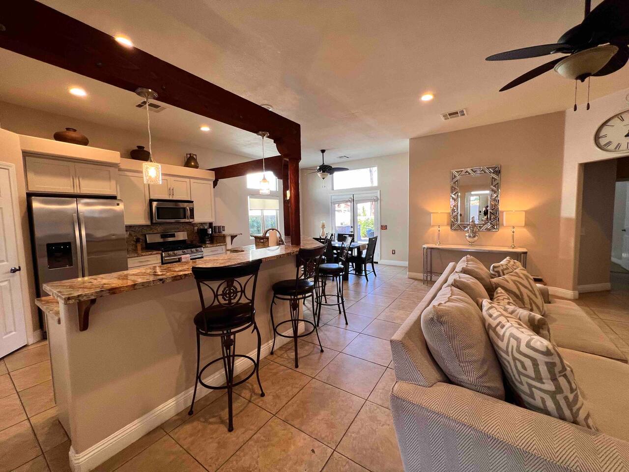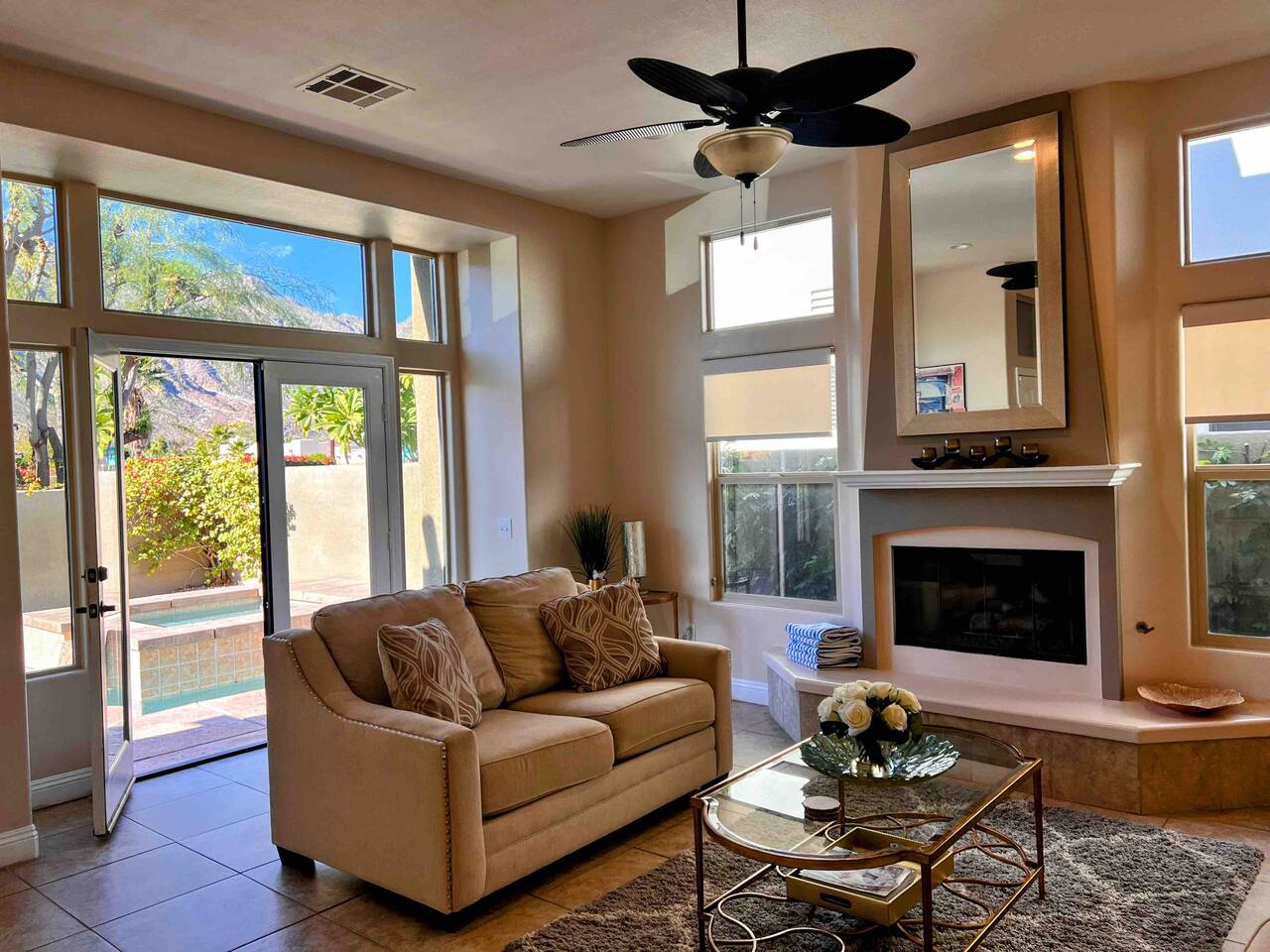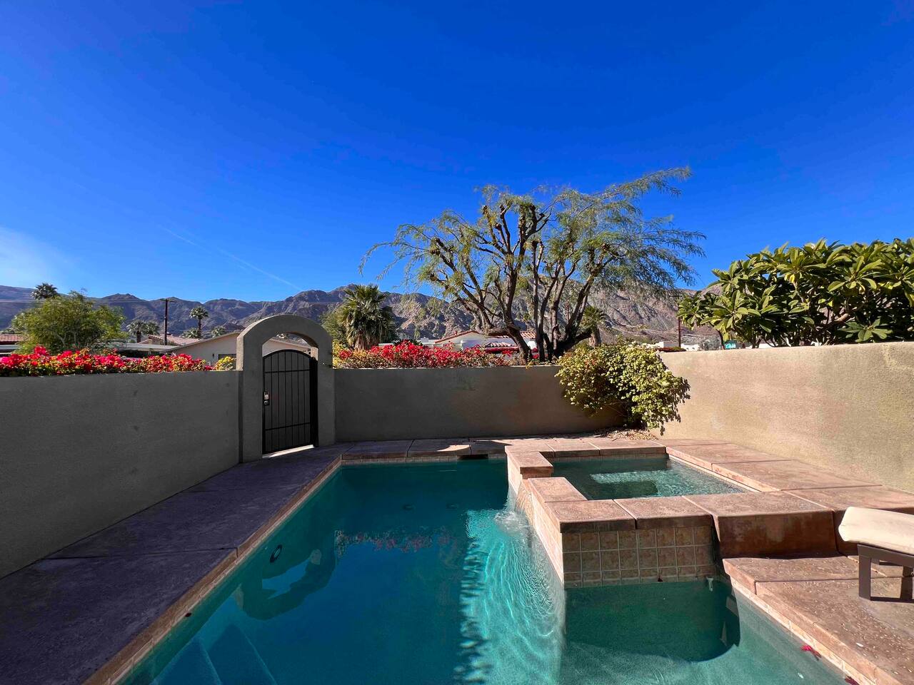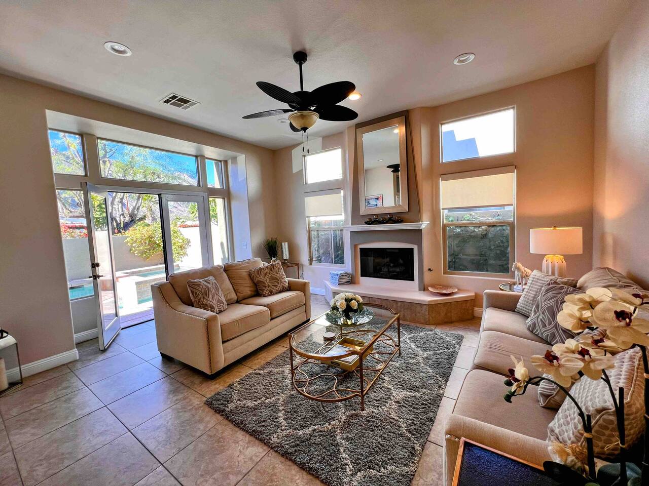 Elegant one story Santa Fe Pool/Spa Home offering 3 BR, 2 BA; sleeps 6 1925 sq ft., 2 Patios, 2 Car Garage. * PRIVATE POOL with SPA and Waterfall offering stunning unobstructed mountain views high up in the Cove. * Hiking Trails close by * WIRELESS high-speed Internet * YouTube Cable, Netflix, Hulu+ Amazon Prime * Family room with Entertainers Kitchen * outside barbeque with dining table * launch chairs * sun umbrella