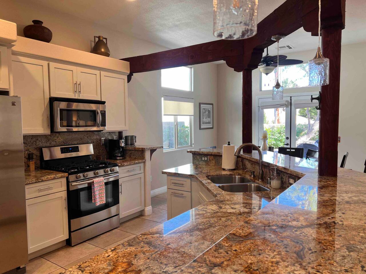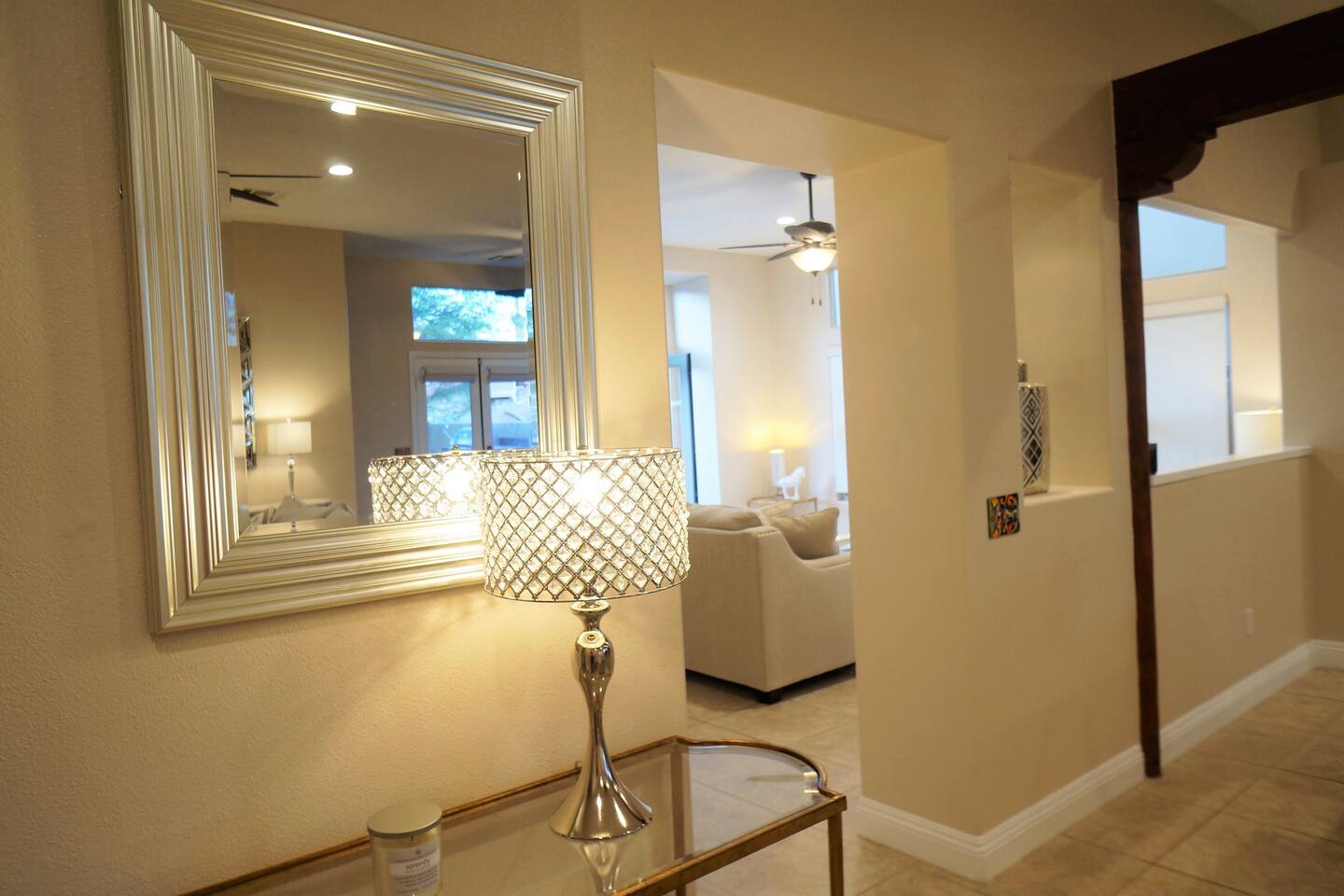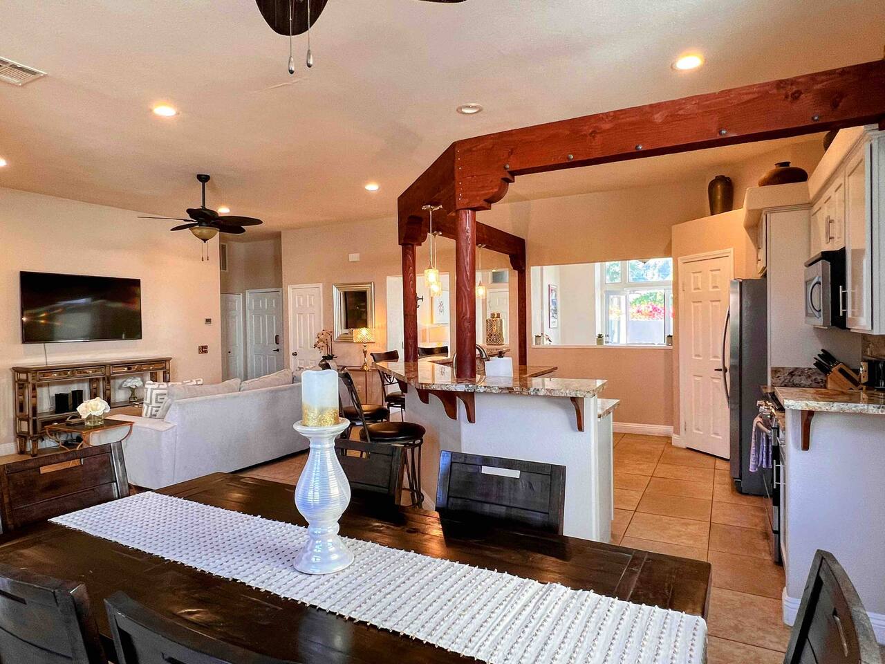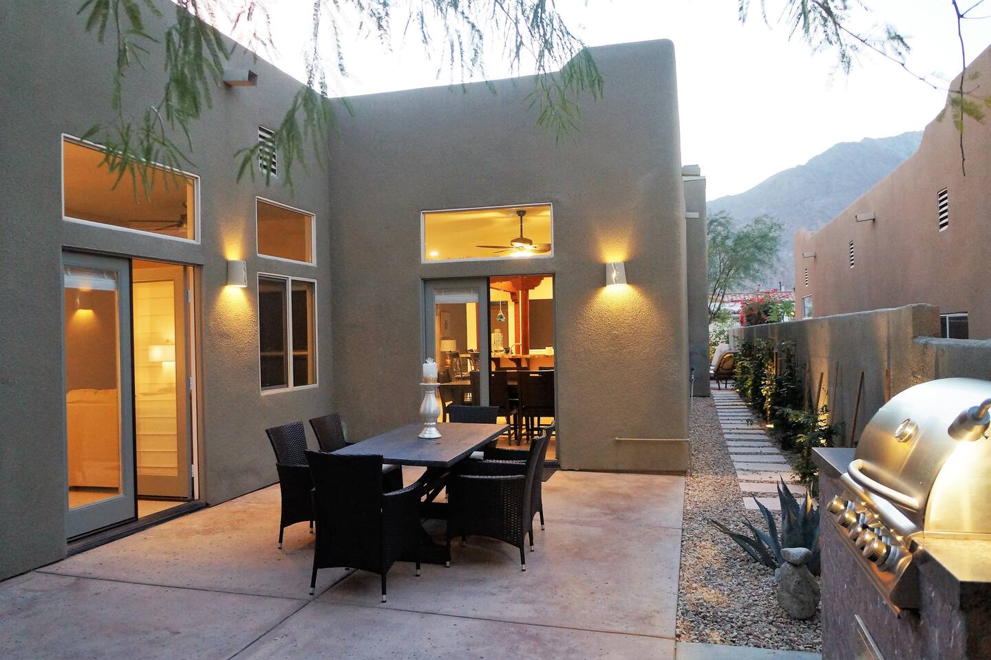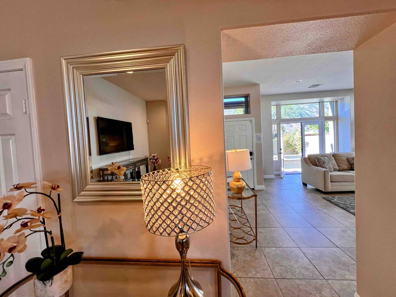 Elegant one story Santa Fe Pool/Spa Home offering 3 BR, 2 BA; sleeps 6 1925 sq ft., 2 Patios, 2 Car Garage. * PRIVATE POOL with SPA and Waterfall offering stunning unobstructed mountain views high up in the Cove. * Hiking Trails close by * WIRELESS high-speed Internet * YouTube Cable, Netflix, Hulu+ Amazon Prime * Family room with Entertainers Kitchen * outside barbeque with dining table * launch chairs * sun umbrella