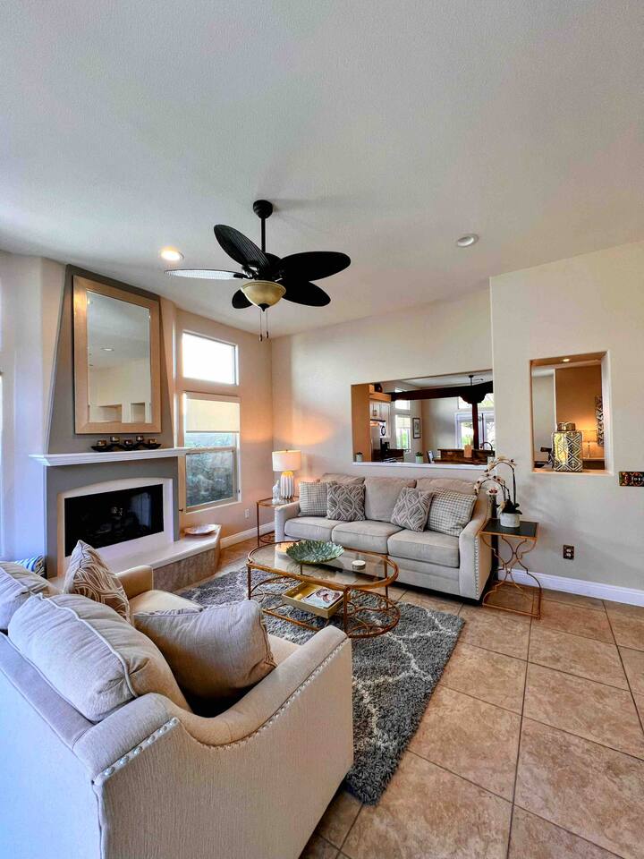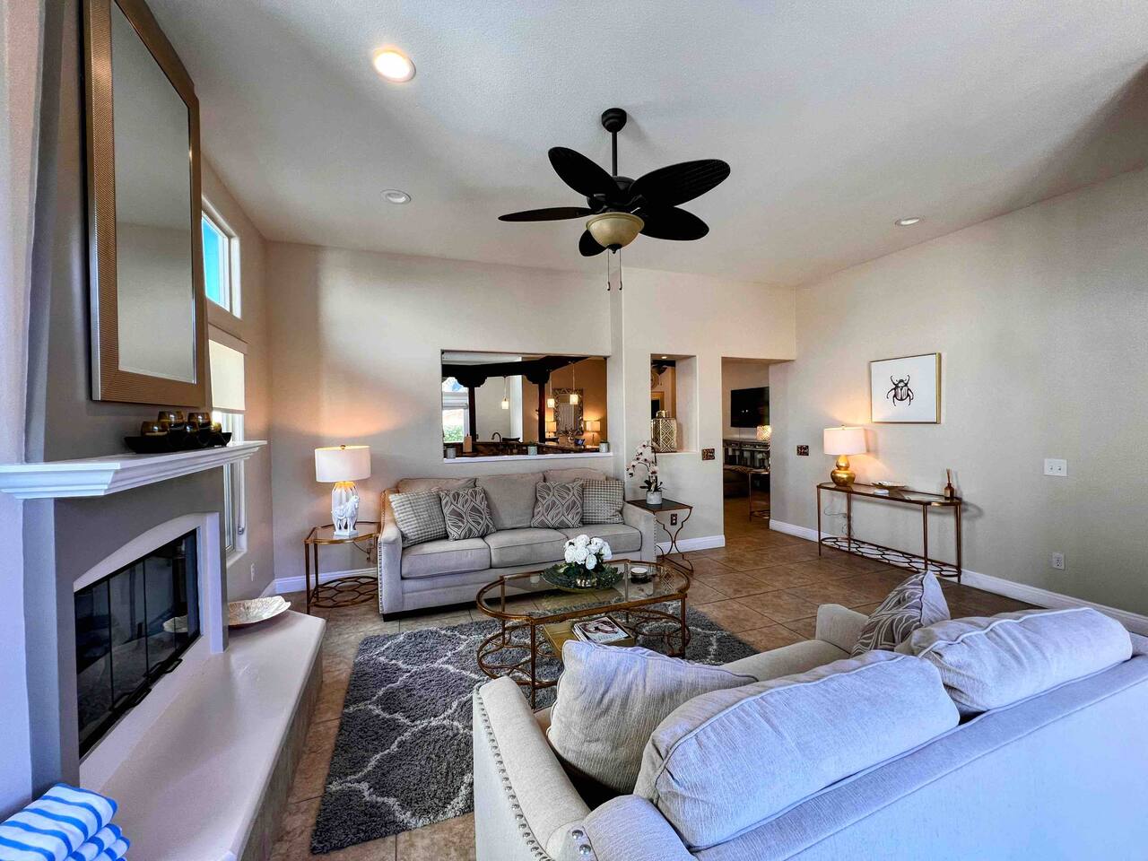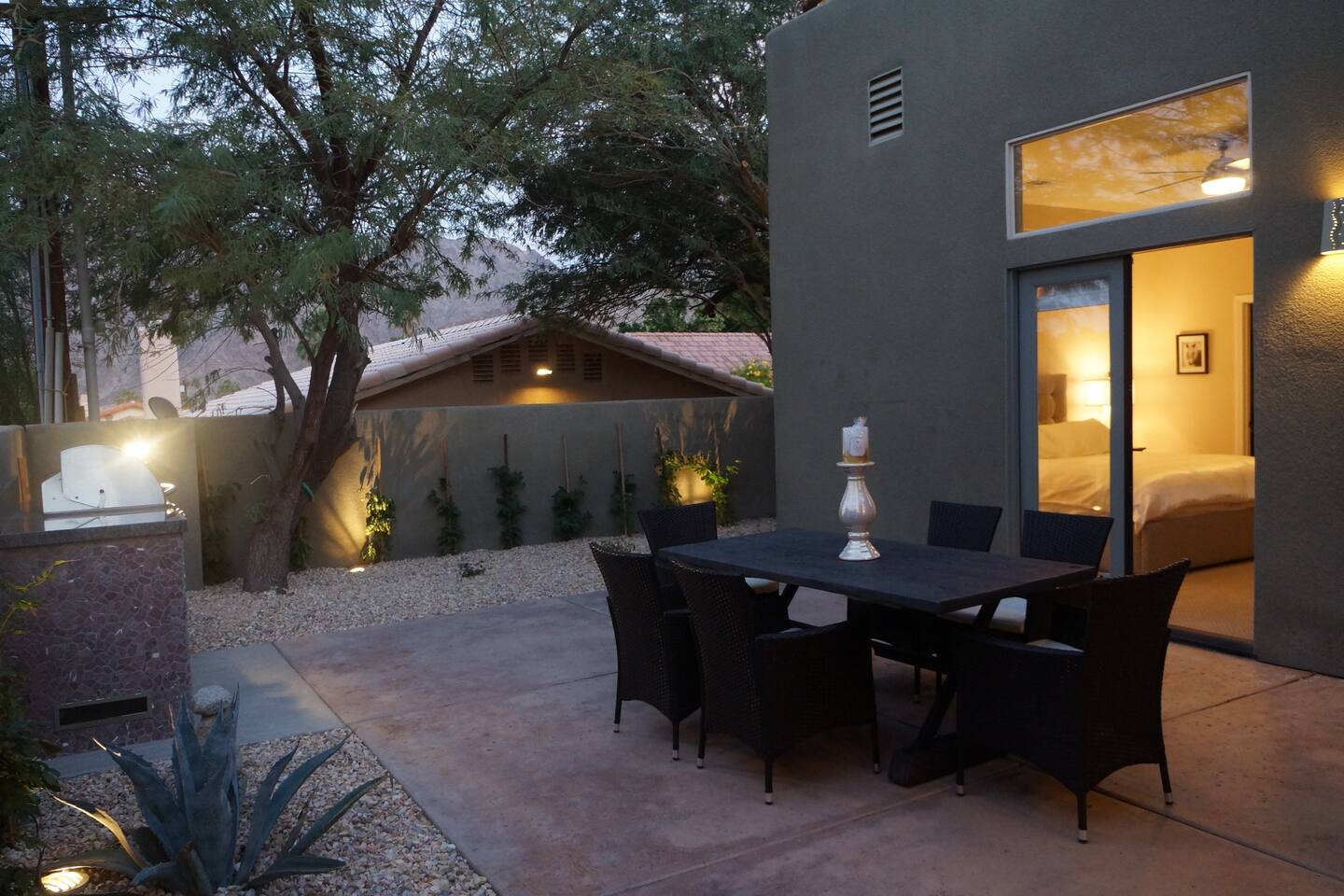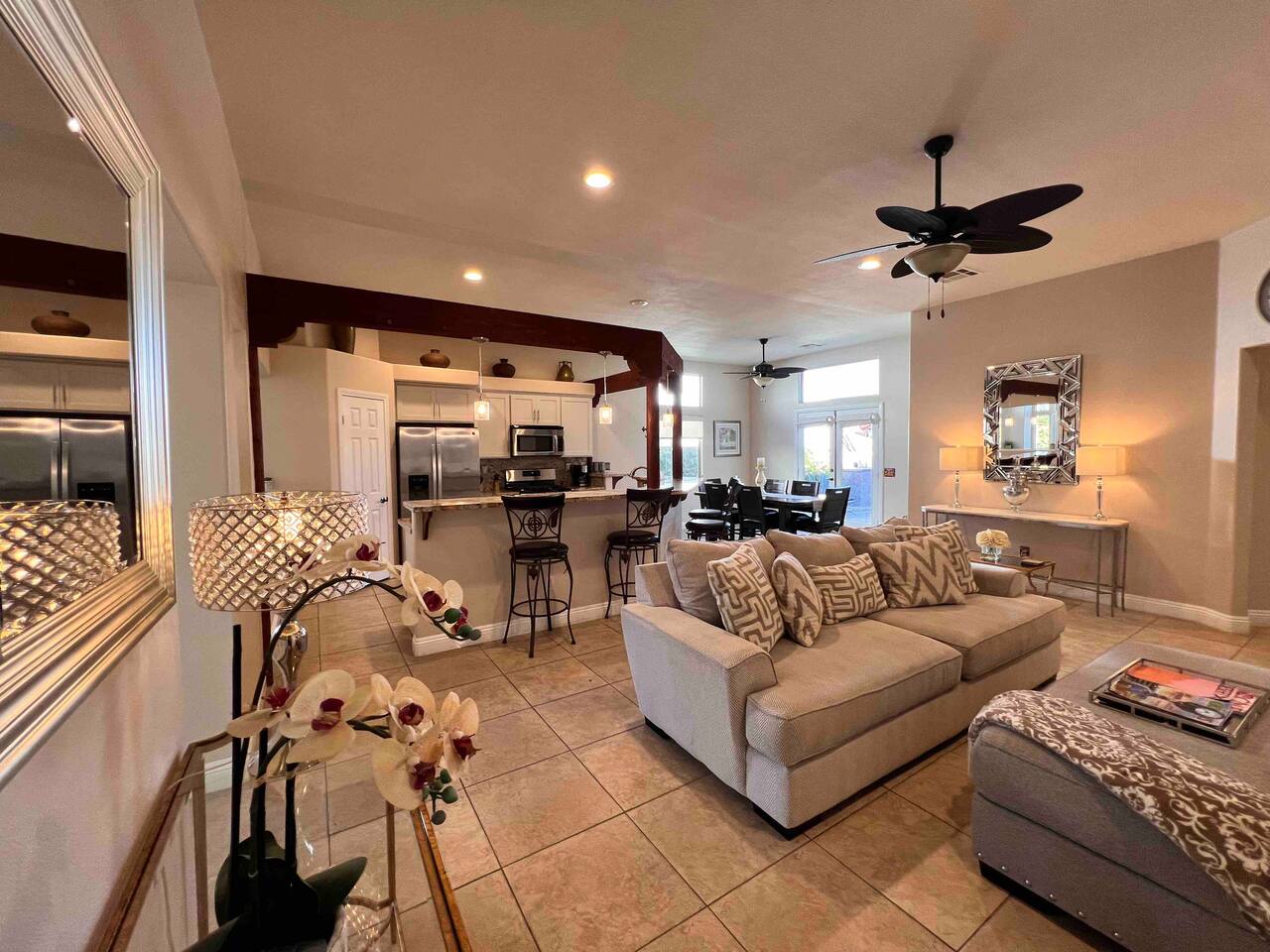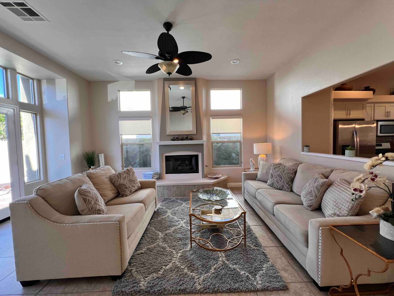 Elegant one story Santa Fe Pool/Spa Home offering 3 BR, 2 BA; sleeps 6 1925 sq ft., 2 Patios, 2 Car Garage. * PRIVATE POOL with SPA and Waterfall offering stunning unobstructed mountain views high up in the Cove. * Hiking Trails close by * WIRELESS high-speed Internet * YouTube Cable, Netflix, Hulu+ Amazon Prime * Family room with Entertainers Kitchen * outside barbeque with dining table * launch chairs * sun umbrella