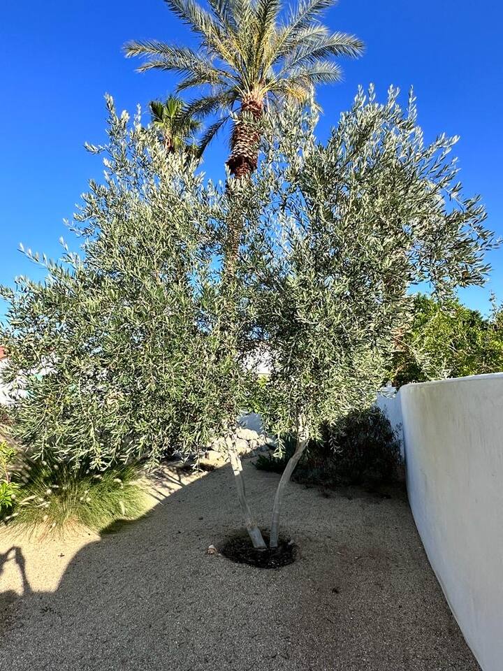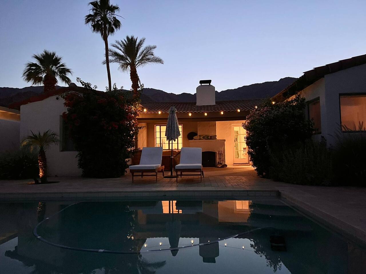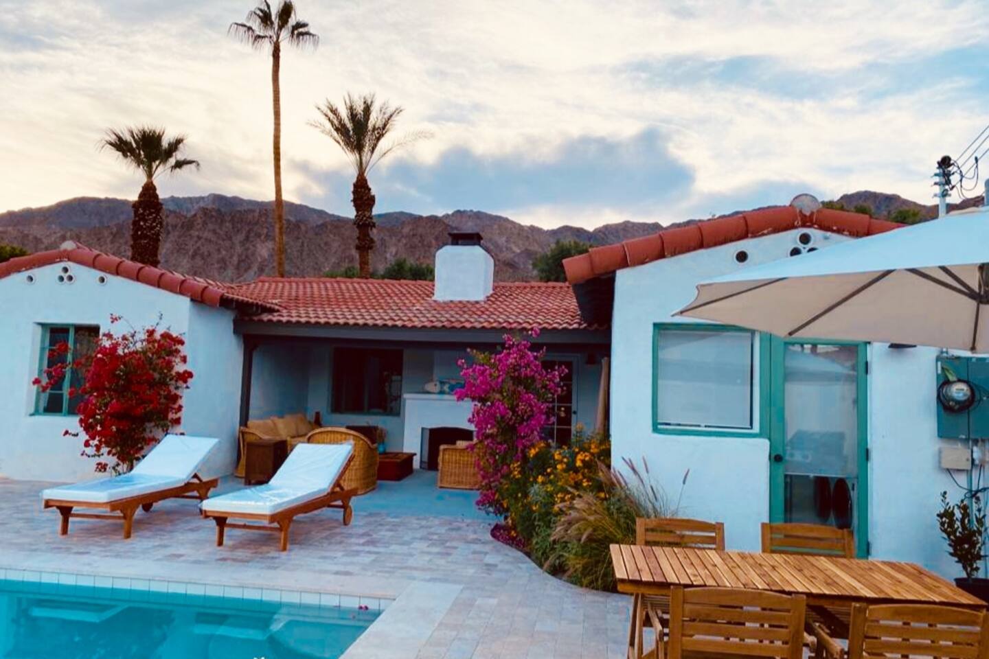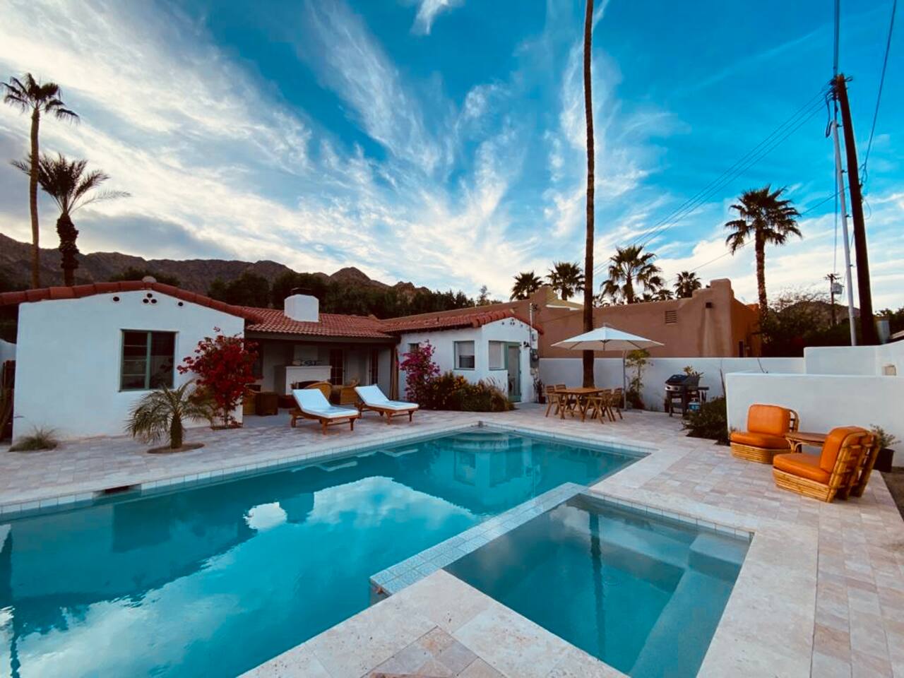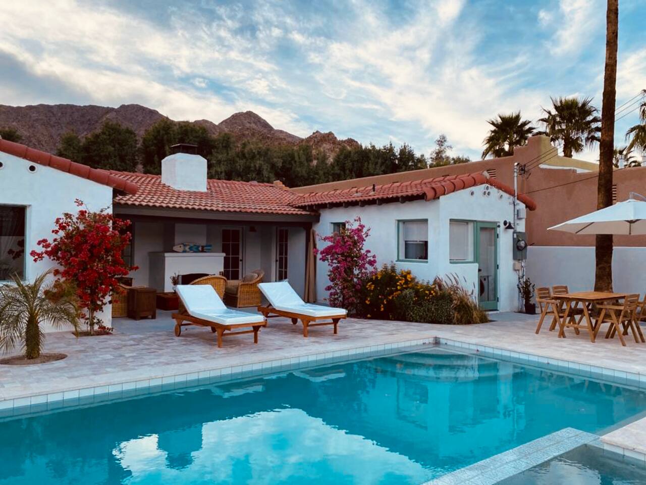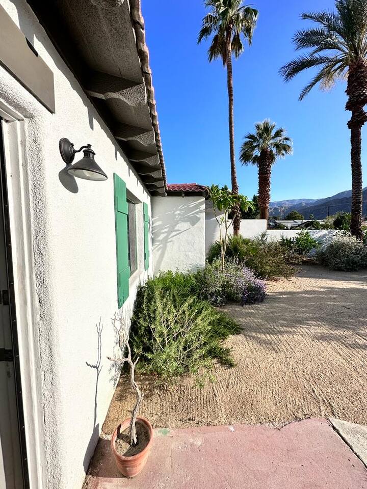 Encounter this authentic Spanish Darling Casita with its NEW scintillating extensive Saltwater Pool and Spa, clandestinely situated in the back of the property fully gated, brilliantly located close to town, and endless hiking/biking trails steps from the front door. Fully remodeled with utmost respect and consideration, be taken by its antiquity and charm. You quickly feel at home, especially observing the original fabulous double-wood-burning fireplace as the star of the living room, including direct access to the covered private back patio with its fully gated saltwater pool with spa and breathtaking mountain views, a secondary fireplace with comfy seating. The rear garden also offers a Weber BBQ with a patio table with seating for four and two launch chairs. The residence flaunts thick Adobe-like walls maintaining the home fresh during the hot desert summers and warm during the crisp winter nights. Also, Saltillo floors throughout the house. The living room has a New Sony SMART TV 55” with cable, Netflix, and other applications. Bedrooms - each bedroom has a new queen mattress with luxury linens and views either over the calming garden or the impressive Santa Rosa mountains. Bathroom - pamper yourself in this all-new bathroom with a substantial step-in shower and a generous modern sink. We also provide organic shampoo, conditioner, and body wash. Kitchen - fully stocked and refurbished kitchen with a stainless steel farmer’s sink, Bosch dishwasher, Samsung French door refrigerator with an icemaker. Equipped with a coffeemaker, French Press, Moka pot, milk frother, blender, and a microwave. Dining - dining table with seating for six people and direct access to the kitchen and the patio. laundry - we have a new washer and dryer
