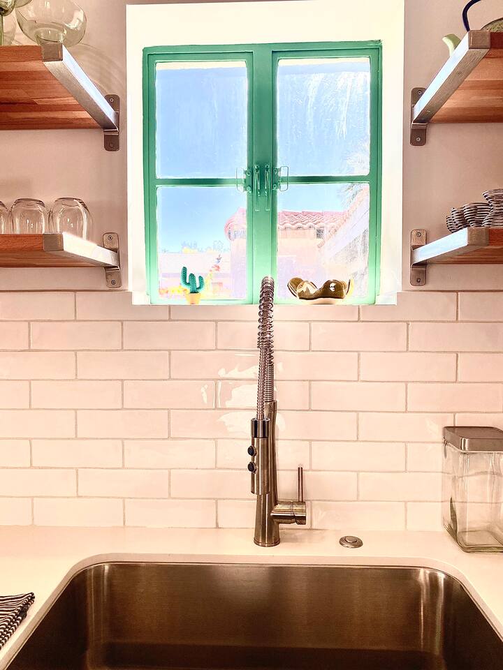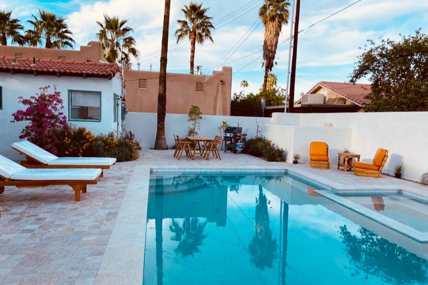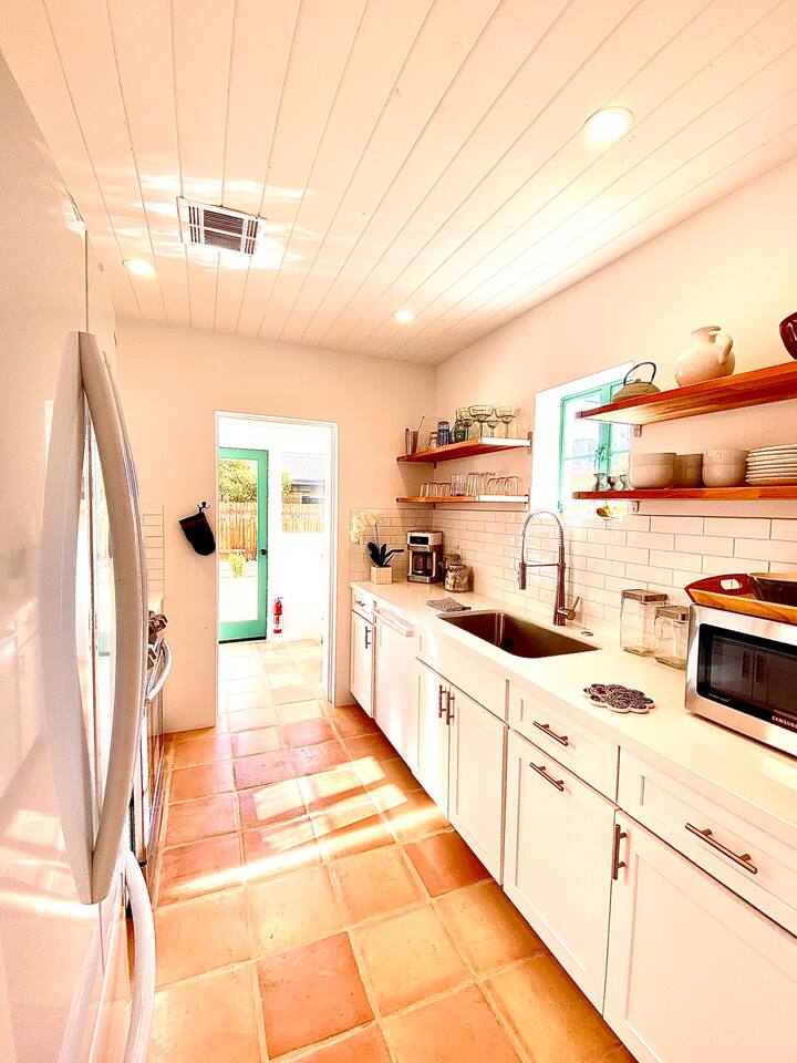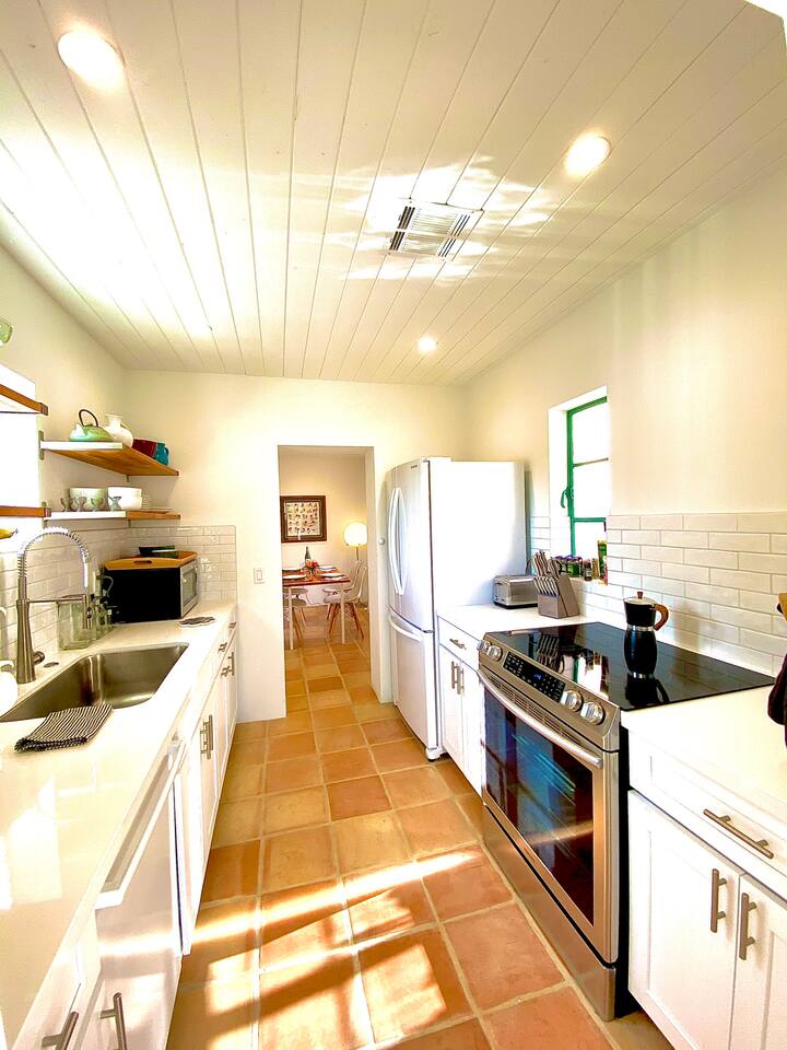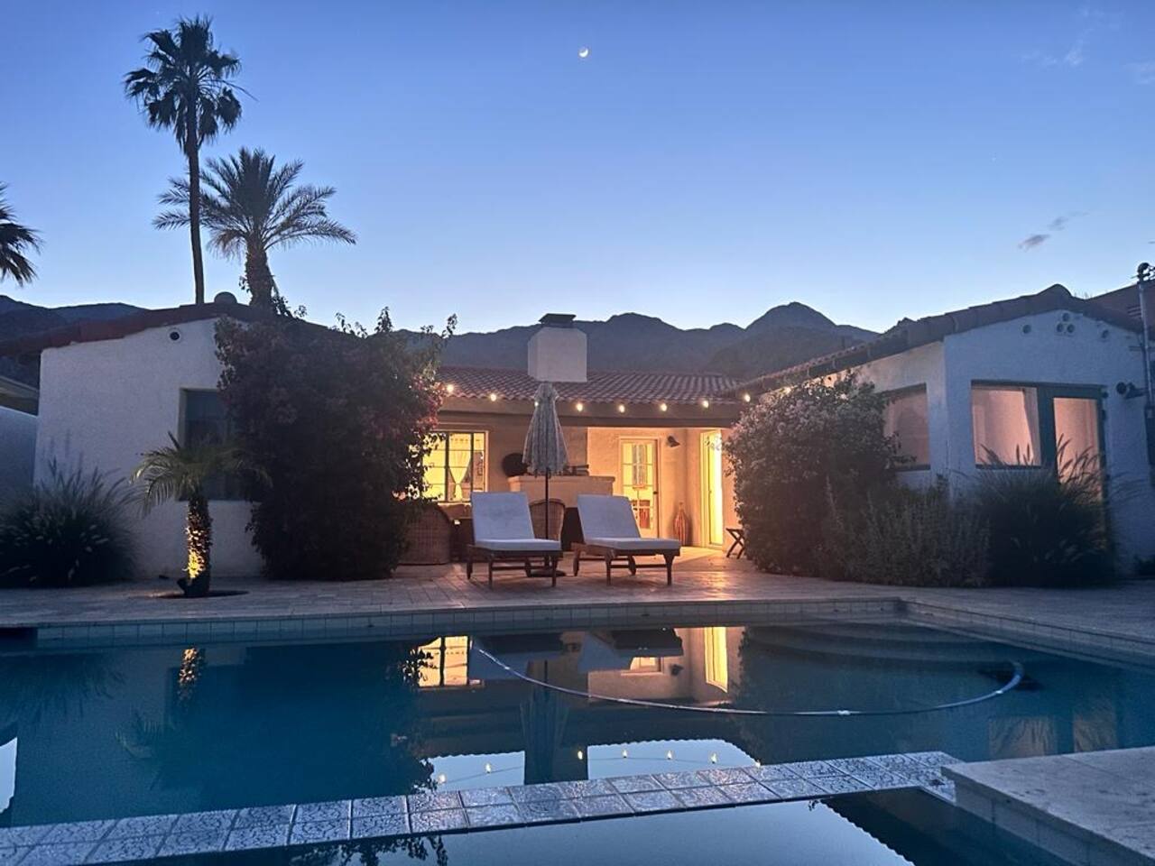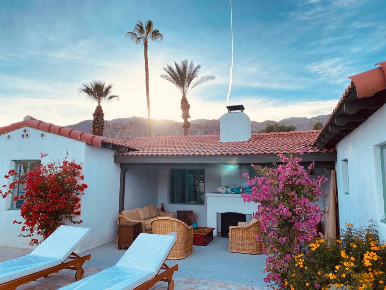 Encounter this authentic Spanish Darling Casita with its NEW scintillating extensive Saltwater Pool and Spa, clandestinely situated in the back of the property fully gated, brilliantly located close to town, and endless hiking/biking trails steps from the front door. Fully remodeled with utmost respect and consideration, be taken by its antiquity and charm. You quickly feel at home, especially observing the original fabulous double-wood-burning fireplace as the star of the living room, including direct access to the covered private back patio with its fully gated saltwater pool with spa and breathtaking mountain views, a secondary fireplace with comfy seating. The rear garden also offers a Weber BBQ with a patio table with seating for four and two launch chairs. The residence flaunts thick Adobe-like walls maintaining the home fresh during the hot desert summers and warm during the crisp winter nights. Also, Saltillo floors throughout the house. The living room has a New Sony SMART TV 55” with cable, Netflix, and other applications. Bedrooms - each bedroom has a new queen mattress with luxury linens and views either over the calming garden or the impressive Santa Rosa mountains. Bathroom - pamper yourself in this all-new bathroom with a substantial step-in shower and a generous modern sink. We also provide organic shampoo, conditioner, and body wash. Kitchen - fully stocked and refurbished kitchen with a stainless steel farmer’s sink, Bosch dishwasher, Samsung French door refrigerator with an icemaker. Equipped with a coffeemaker, French Press, Moka pot, milk frother, blender, and a microwave. Dining - dining table with seating for six people and direct access to the kitchen and the patio. laundry - we have a new washer and dryer