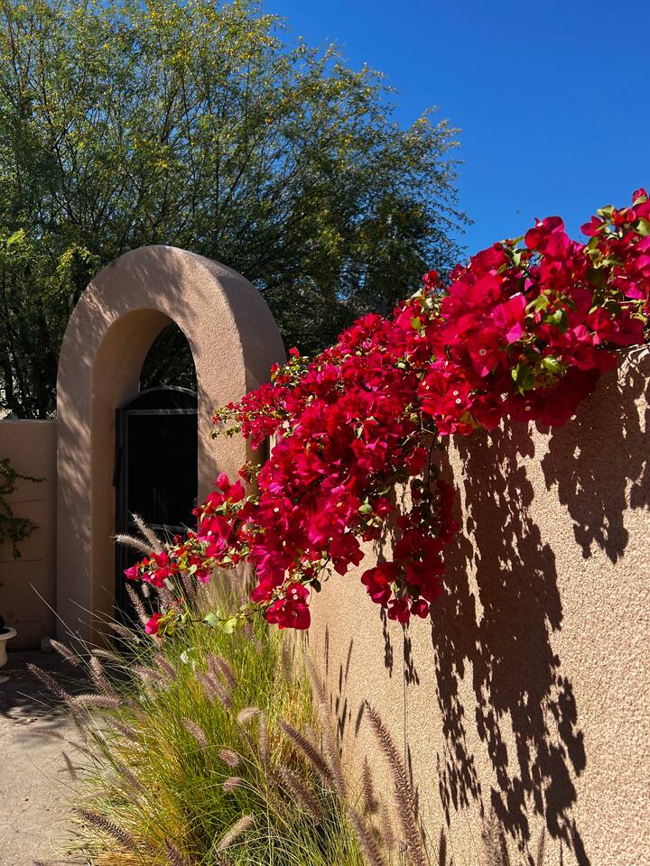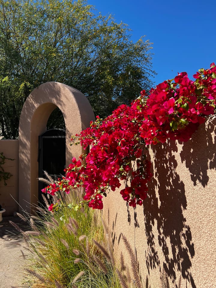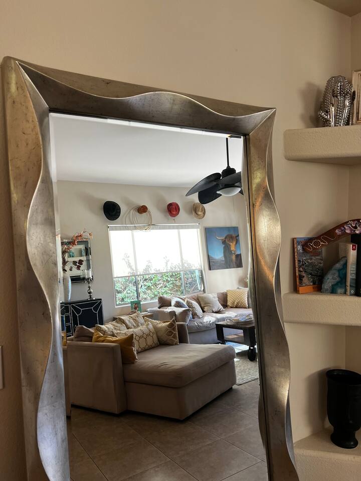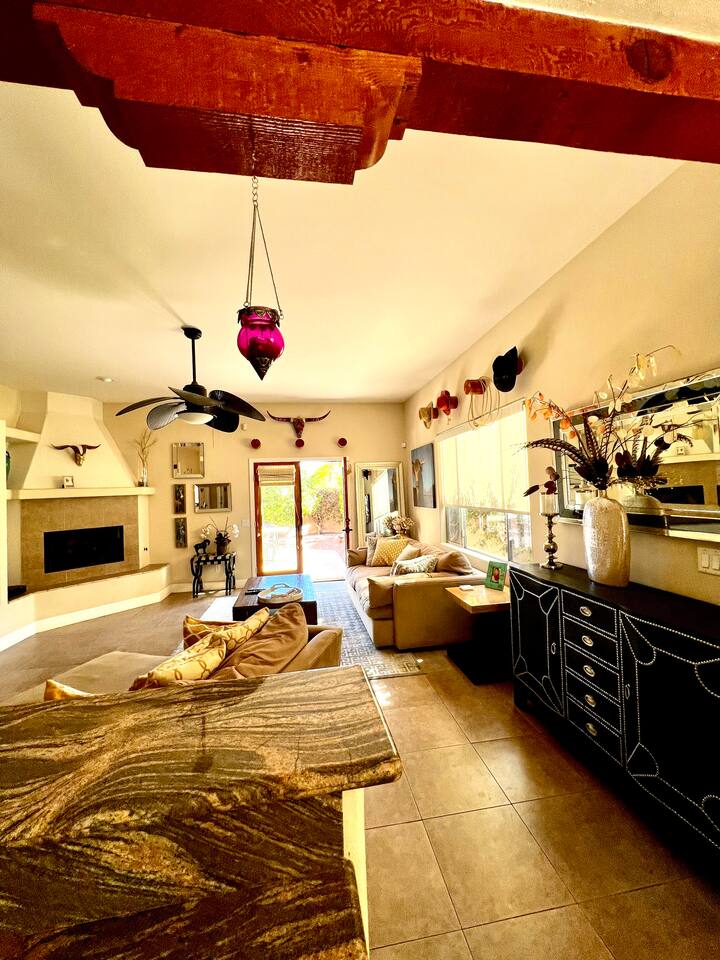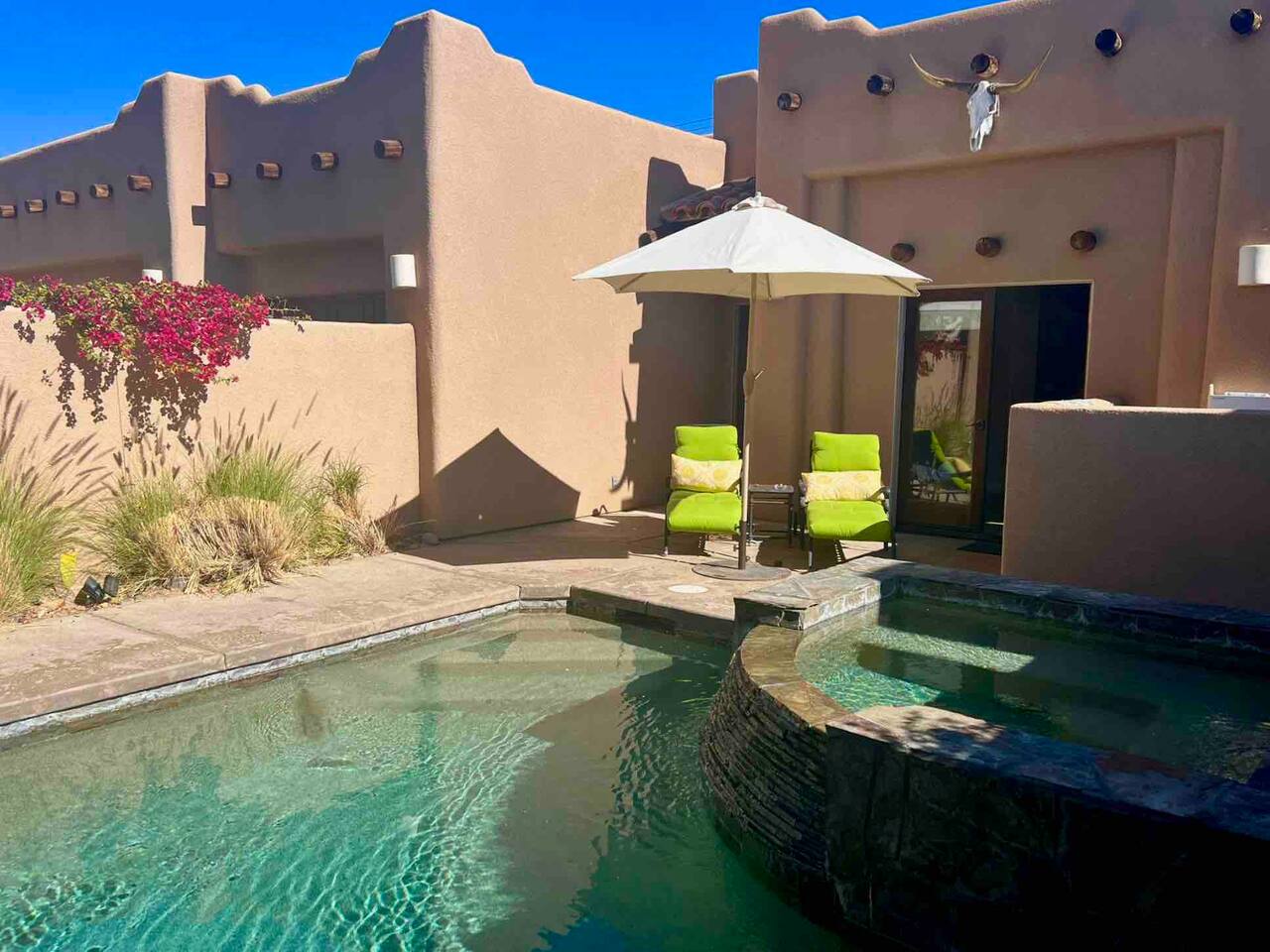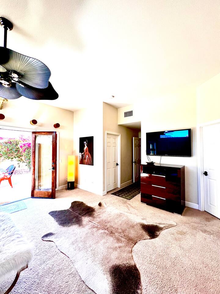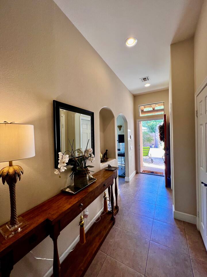 * PRIVATE PebbleTech Pool/Spa with Waterfall * Pet lovers welcome, fully walled * Fast, secure WiFi * We offer Netflix, Hulu, Apple TV, HBO Max, Starz, YouTube, Sling, and Spectrum * Elegant Living Room with 50" TV and Roku * Large Primary Bedroom with 55" TV and Roku * Second Bedroom with 50" TV and Roku * Two patios with outdoor tables and chairs for six * Hiking/Biking trails nearby * Public tennis courts and pickleball courts nearby * Gas barbecue * Two lounge chairs with an umbrella
