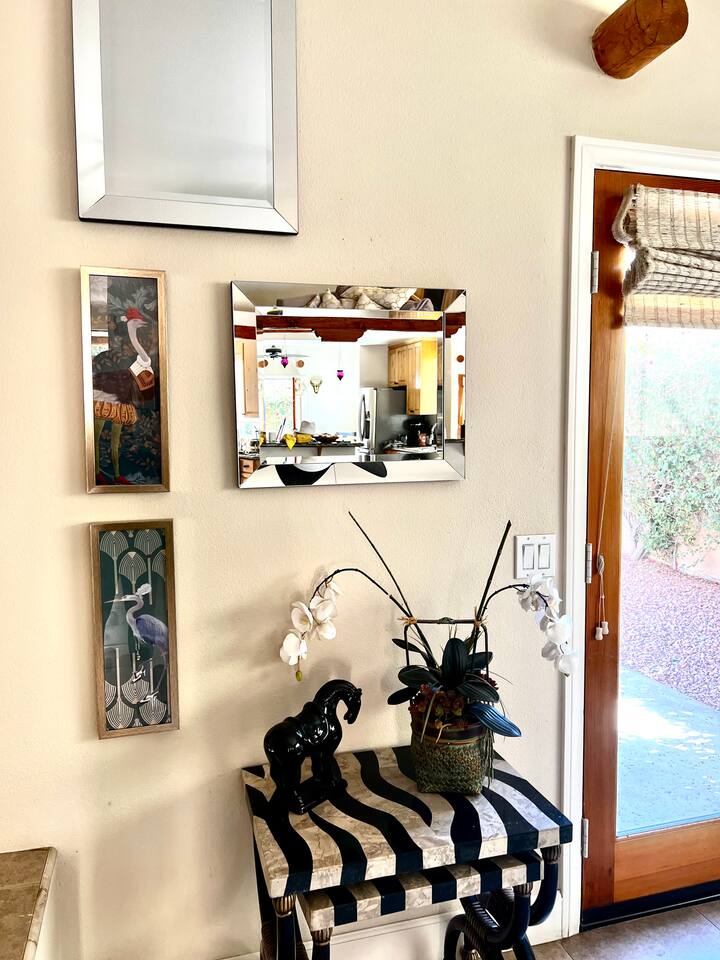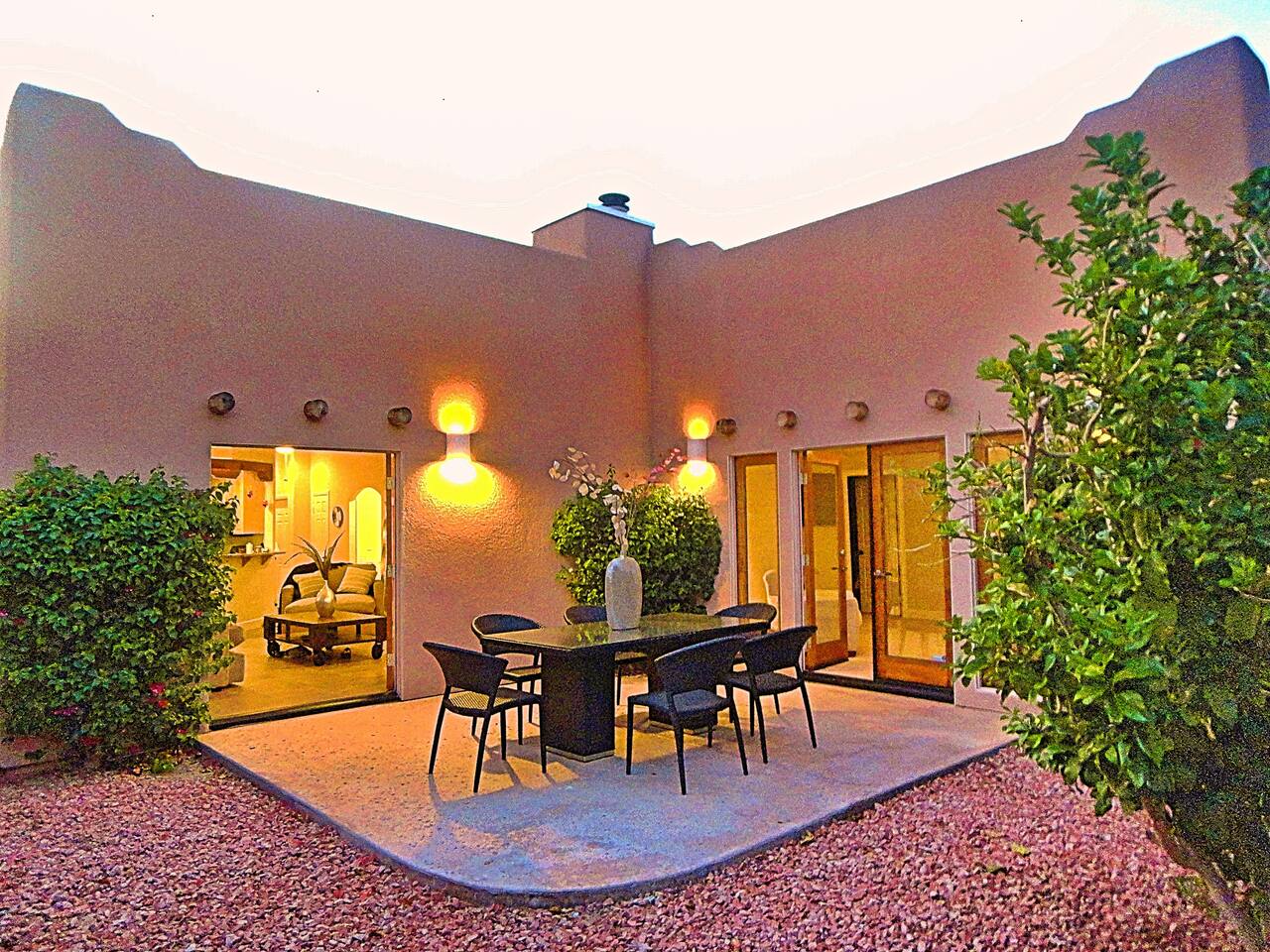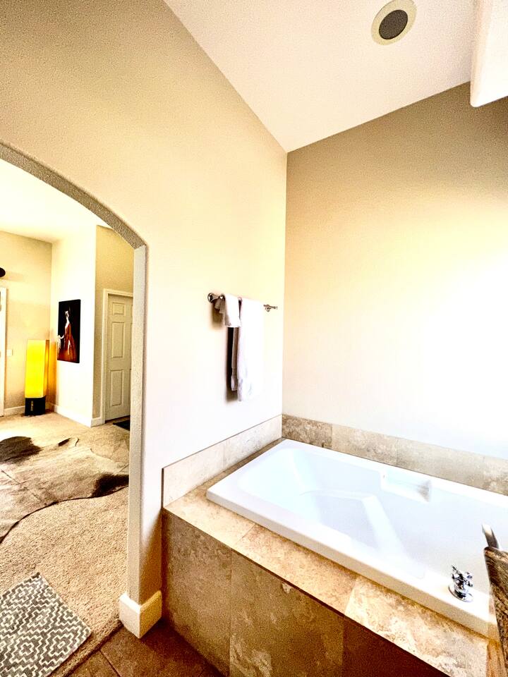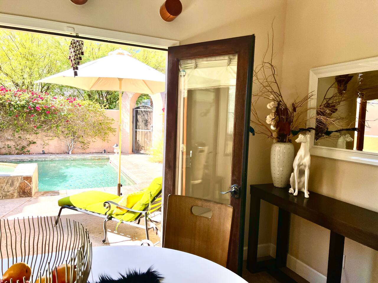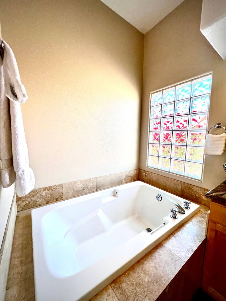 * PRIVATE PebbleTech Pool/Spa with Waterfall * Pet lovers welcome, fully walled * Fast, secure WiFi * We offer Netflix, Hulu, Apple TV, HBO Max, Starz, YouTube, Sling, and Spectrum * Elegant Living Room with 50" TV and Roku * Large Primary Bedroom with 55" TV and Roku * Second Bedroom with 50" TV and Roku * Two patios with outdoor tables and chairs for six * Hiking/Biking trails nearby * Public tennis courts and pickleball courts nearby * Gas barbecue * Two lounge chairs with an umbrella