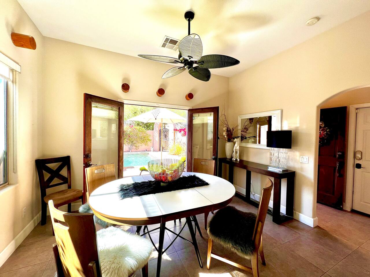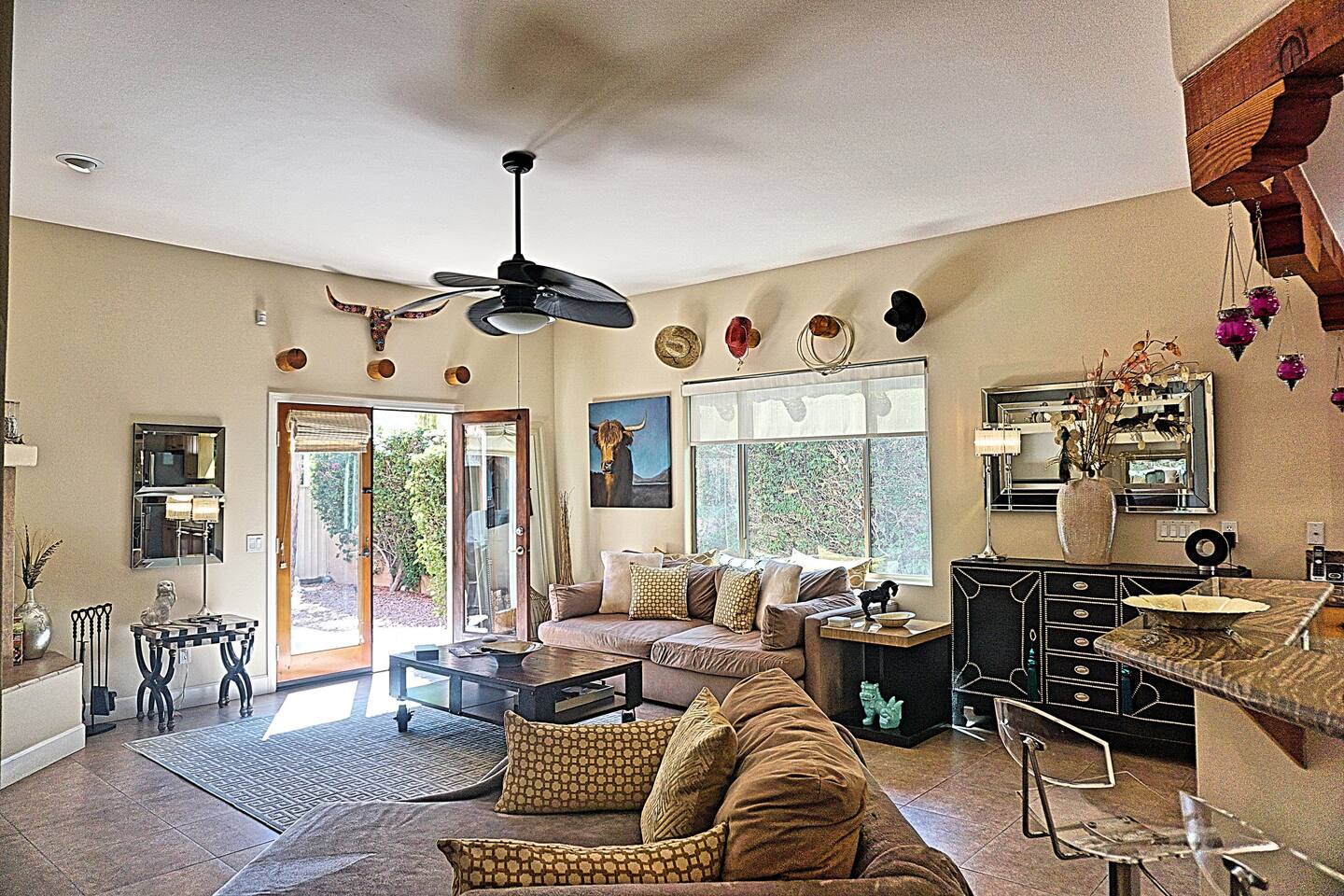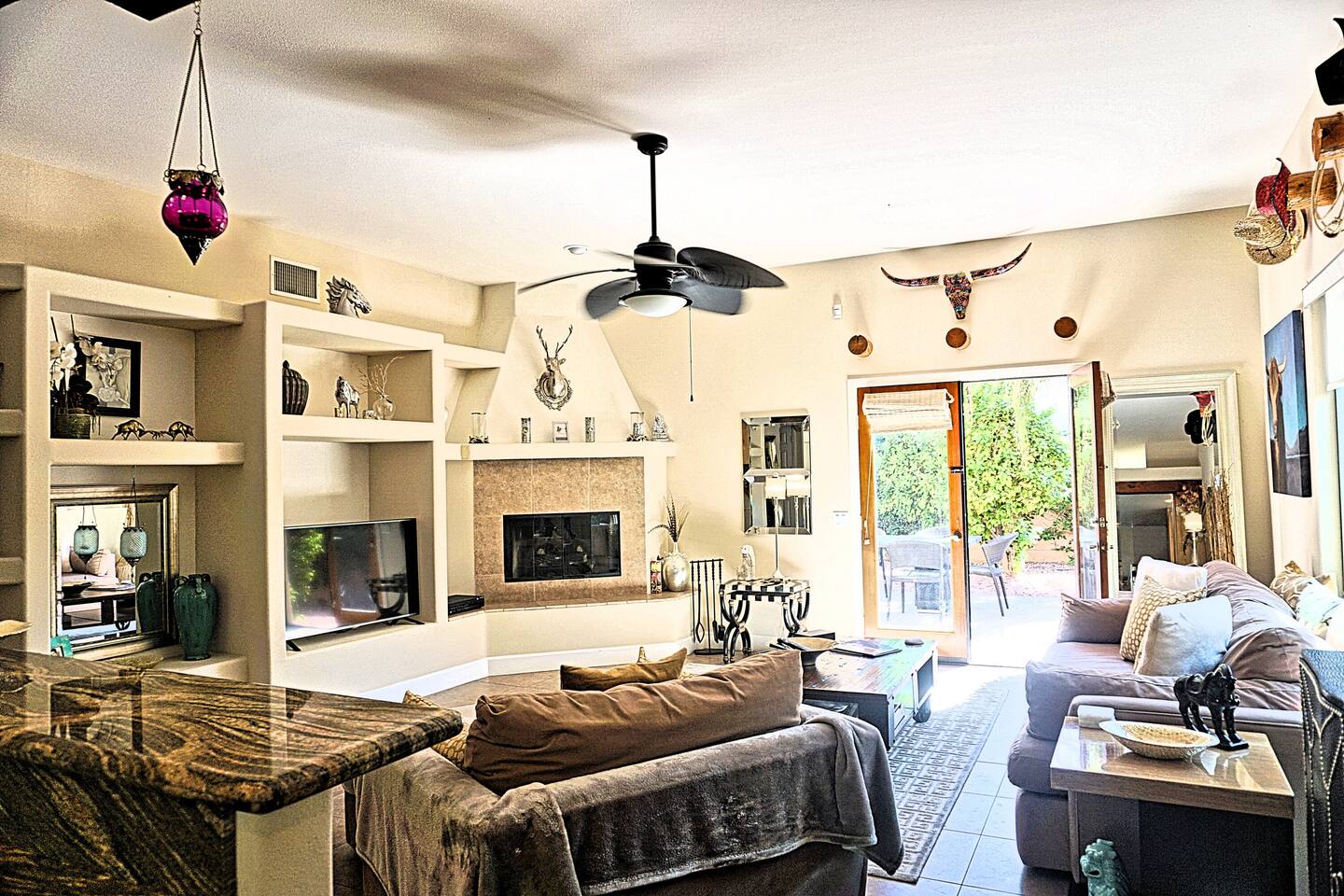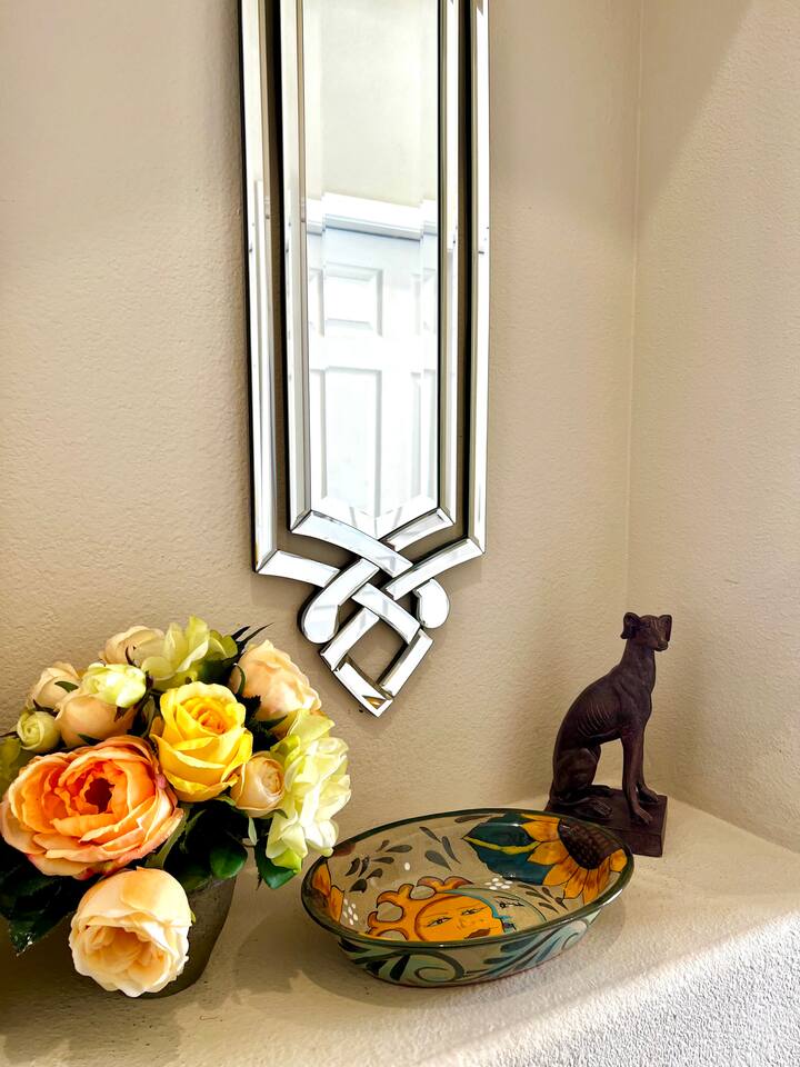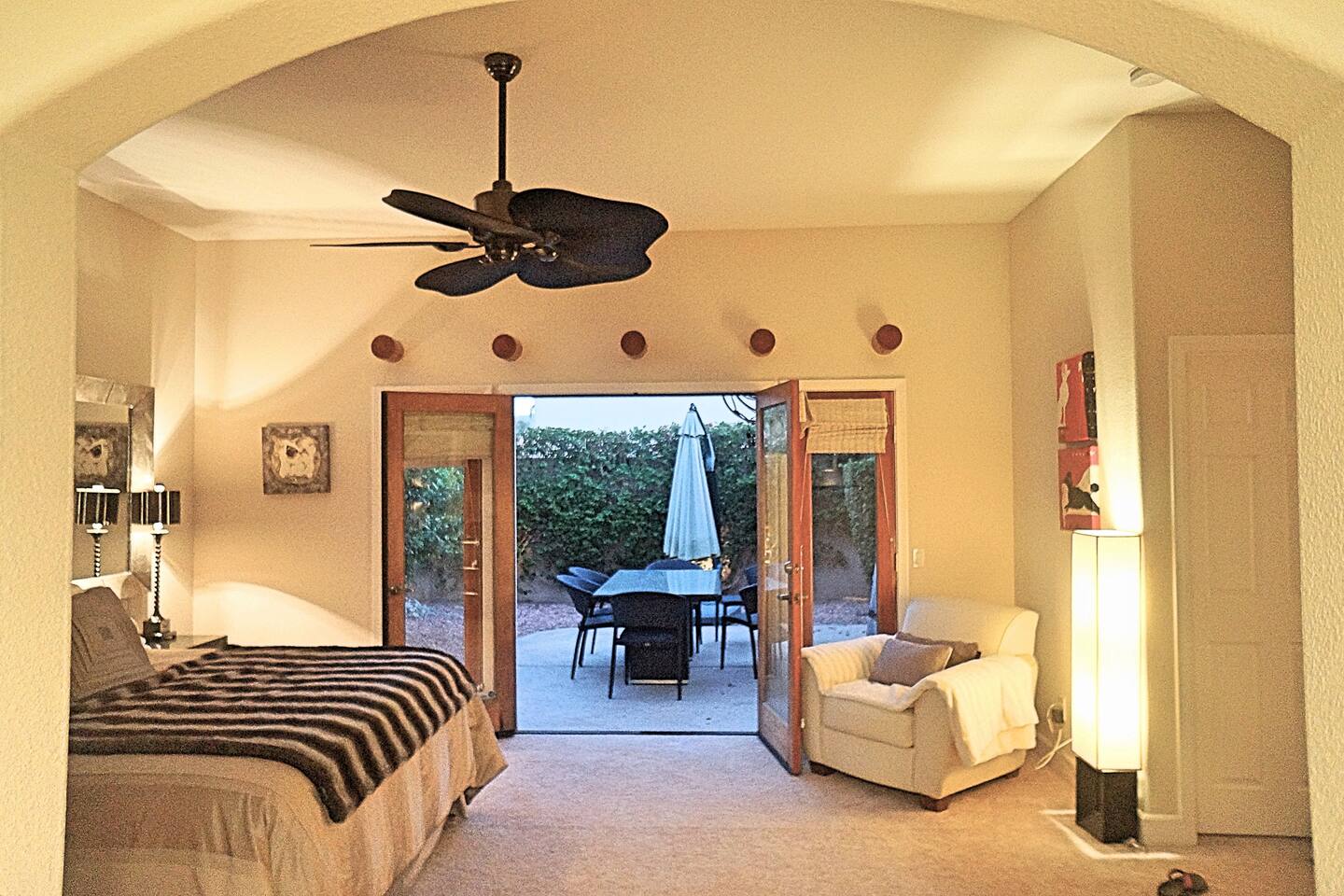 * PRIVATE PebbleTech Pool/Spa with Waterfall * Pet lovers welcome, fully walled * Fast, secure WiFi * We offer Netflix, Hulu, Apple TV, HBO Max, Starz, YouTube, Sling, and Spectrum * Elegant Living Room with 50" TV and Roku * Large Primary Bedroom with 55" TV and Roku * Second Bedroom with 50" TV and Roku * Two patios with outdoor tables and chairs for six * Hiking/Biking trails nearby * Public tennis courts and pickleball courts nearby * Gas barbecue * Two lounge chairs with an umbrella