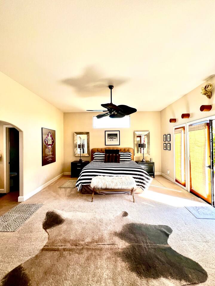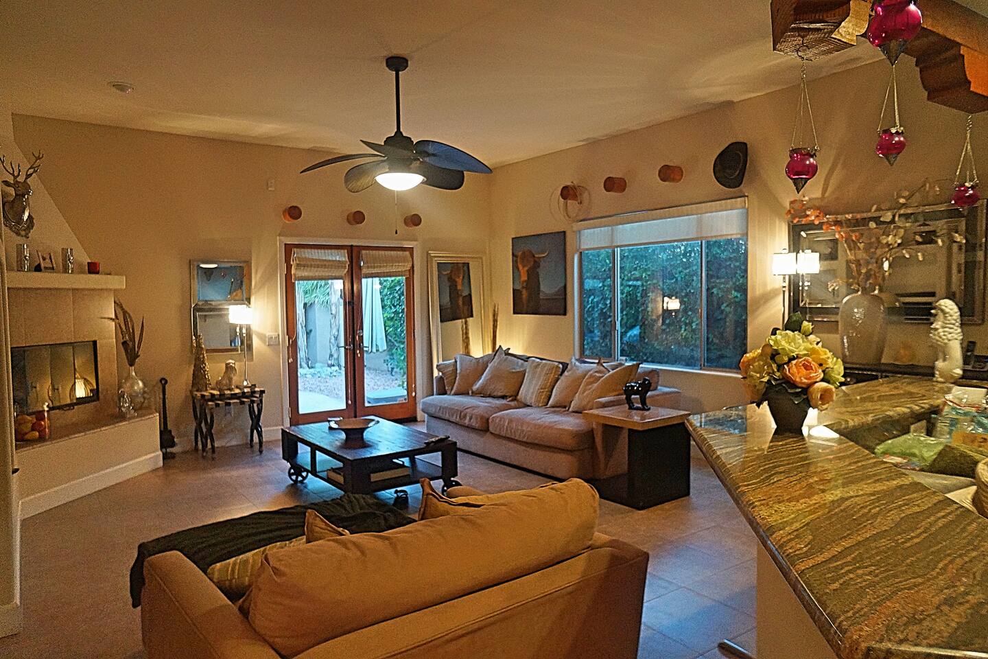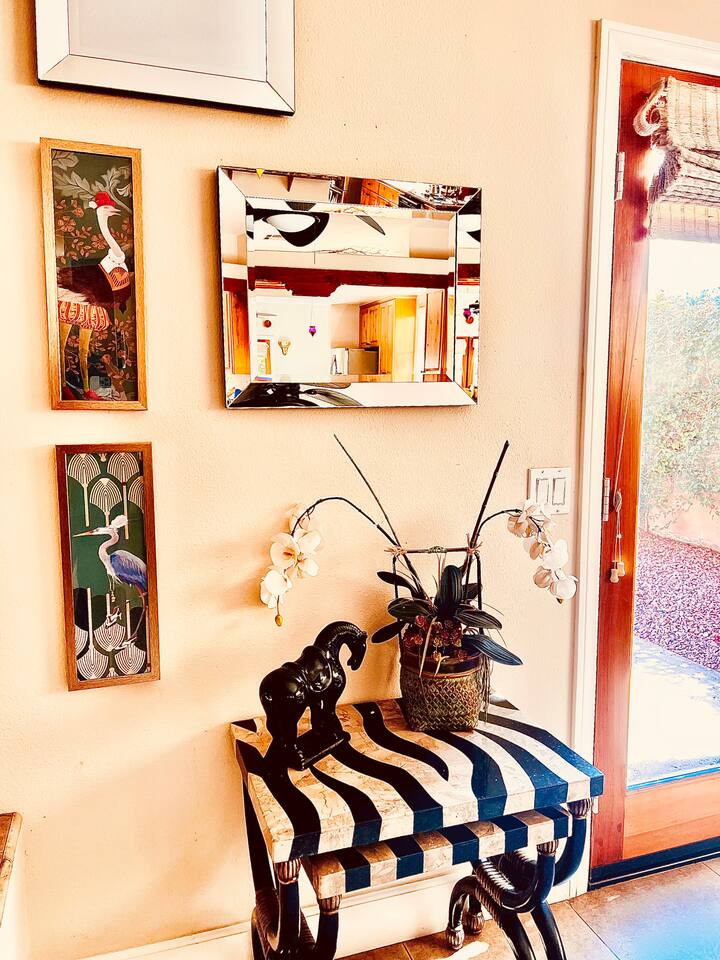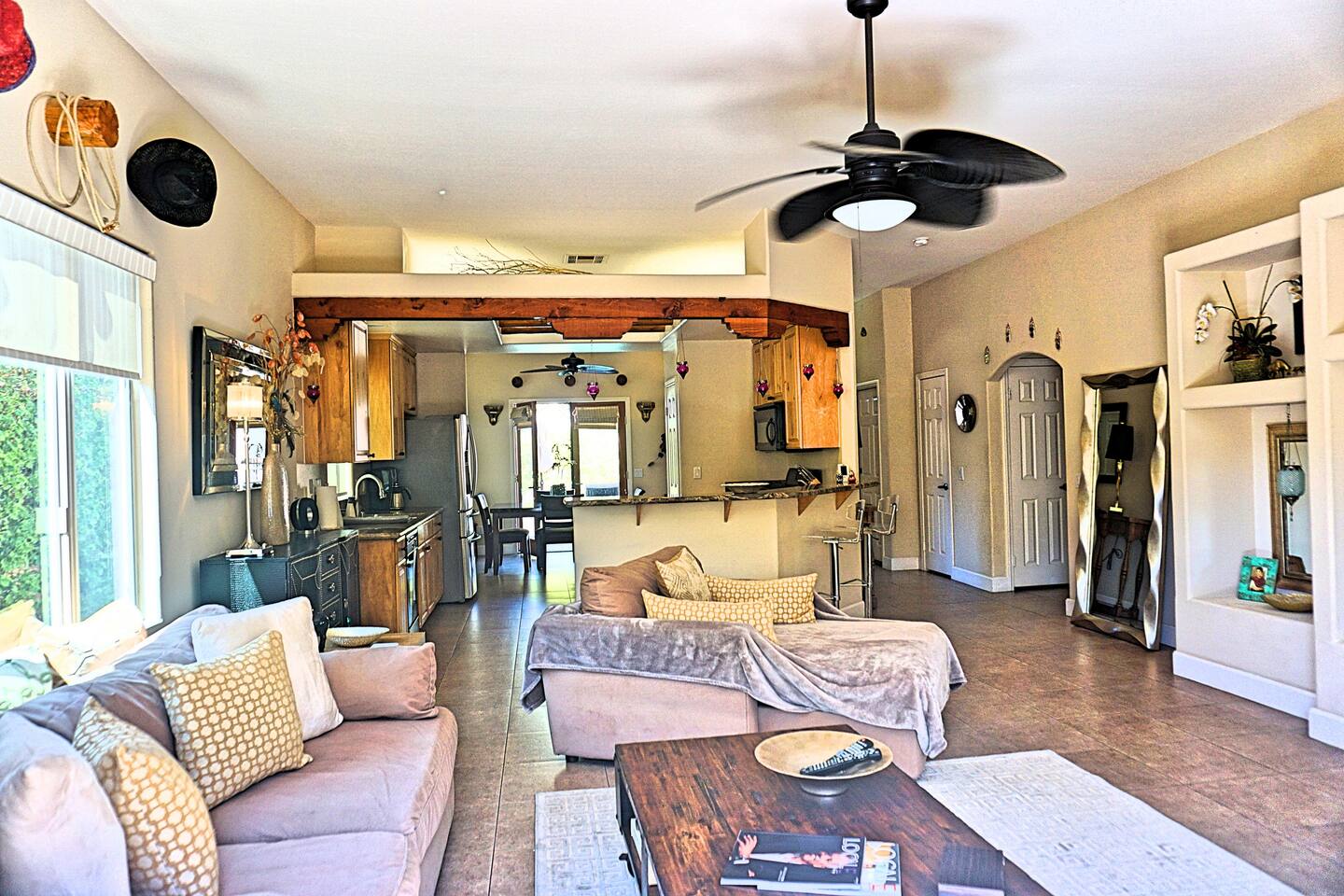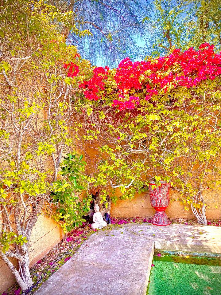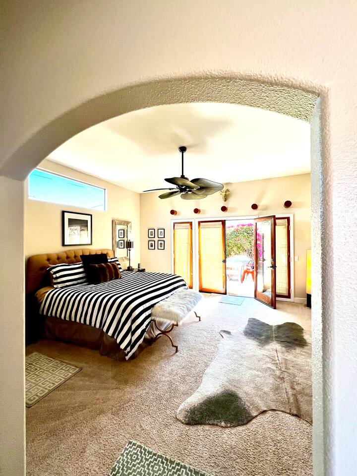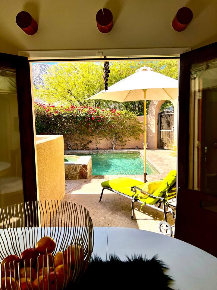 * PRIVATE pebble tech Pool and Spa with waterfall * The entire property is fully walled and safe for Pet lovers * For babies, we offer a highchair, a crib, a baby stroller, and a sitting play roller * Secure, fast Wi-Fi speeds. * We offer Netflix, Hulu, Apple TV, HBOMax, Starz, YouTube, and Sling Live TV. * Elegant Living Room 50" TV with Roku * Large Primary Bedroom 55" TV with Roku * 2nd bedroom 50" TV with Roku * 2 Patios, one with an outdoor table and chairs fitting six, and the other patio with two lounge chairs * Hiking/Biking Trails close by * Village walking distance * Public Tennis Courts close by * Barbecue gas * 2 Lounge chairs + umbrella * For babies, we offer a highchair, a crib, a baby stroller, and a sitting play roller Smooth, welcoming SINGLE LEVEL Santa Fe 1,800 sqft POOL/SPA Villa with stunning Mountain Views located in the renowned La Quinta Cove, just minutes from the famous La Quinta Spa Resort. Enjoy the PRIVATE Pebble Tech Pool/Spa with a relaxing waterfall and marvel at the countless stars at night. Pet-friendly property! Fully gated yard! Close to numerous hiking and biking trails and "Old Town La Quinta." The open living room features a cozy fireplace and direct access to the back patio. It includes a smart LG 4K TV 50 BBQ on the PATIO area, outdoor dining table fitting six people 12 FEET CEILINGS in the Living Room with recessed lights on dimmers and a cozy fireplace. Direct admission to the patio from the living room. French doors also lead from the dining room to the fully walled pool and the front patio. The kitchen is open to the living room and has a bar, a stainless steel SAMSUNG refrigerator, and filtered water. This fully stocked kitchen features a toaster, microwave, dishwasher, garbage disposal, a coffee maker (regular and Keurig), and more. Extensive PRIMARY BEDROOM SUITE with a full en-suite bathroom, king-size bed, and generous walk-in closet. Its 10 ft ceilings and French doors traversing to the back patio offer comprehensive privacy and indulgence. Two further peaceful bedrooms, each with a plush queen bed and walk-in closets. Whether it is diversion or business that brings you to La Quinta, you will want to strike a round of GOLF at one of the many great golf courses, go HIKING, play TENNIS (courts just 5 minutes away, and for FREE), fancy a day of SHOPPING on 'El Paseo' or spoil yourself at one of the FULL-SERVICE SPAS as the classy historical 'LA QUINTA Resort and Club WALDORF ASTORIA. The best place to get your coffee or breakfast in the morning is 'THE OLD TOWN' in La Quinta, which is just 2 minutes by car or 15-20 minutes on foot. This palliative home offers all the comfort and support you need to pause your agenda and connect with family or friends. We love the freedom of opening the gate, exercising our dogs on the nearby trails in the Cove, and relishing the endless refinement and recreation of the desert. We cannot wait to treat you as you deserve, regal treatment.