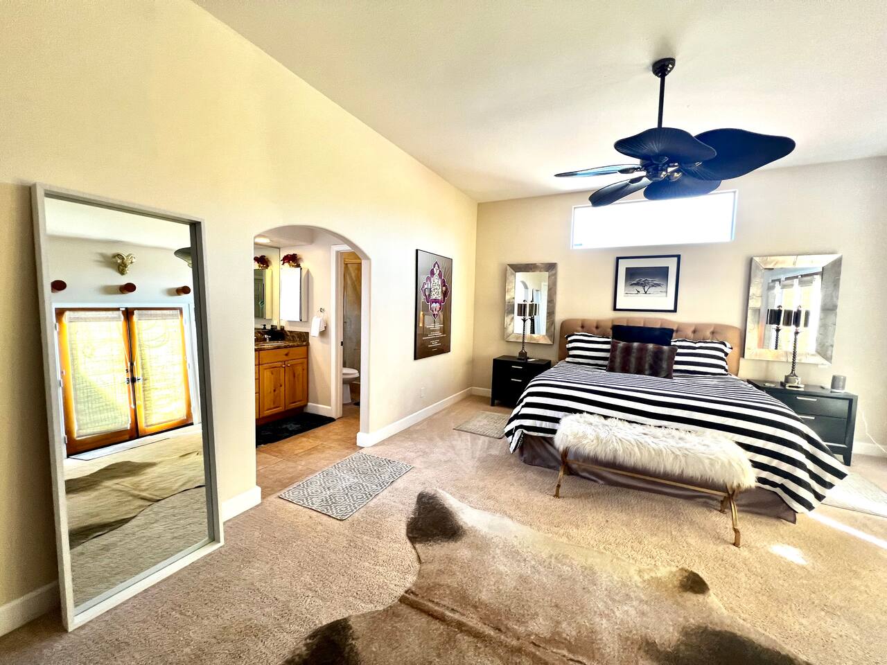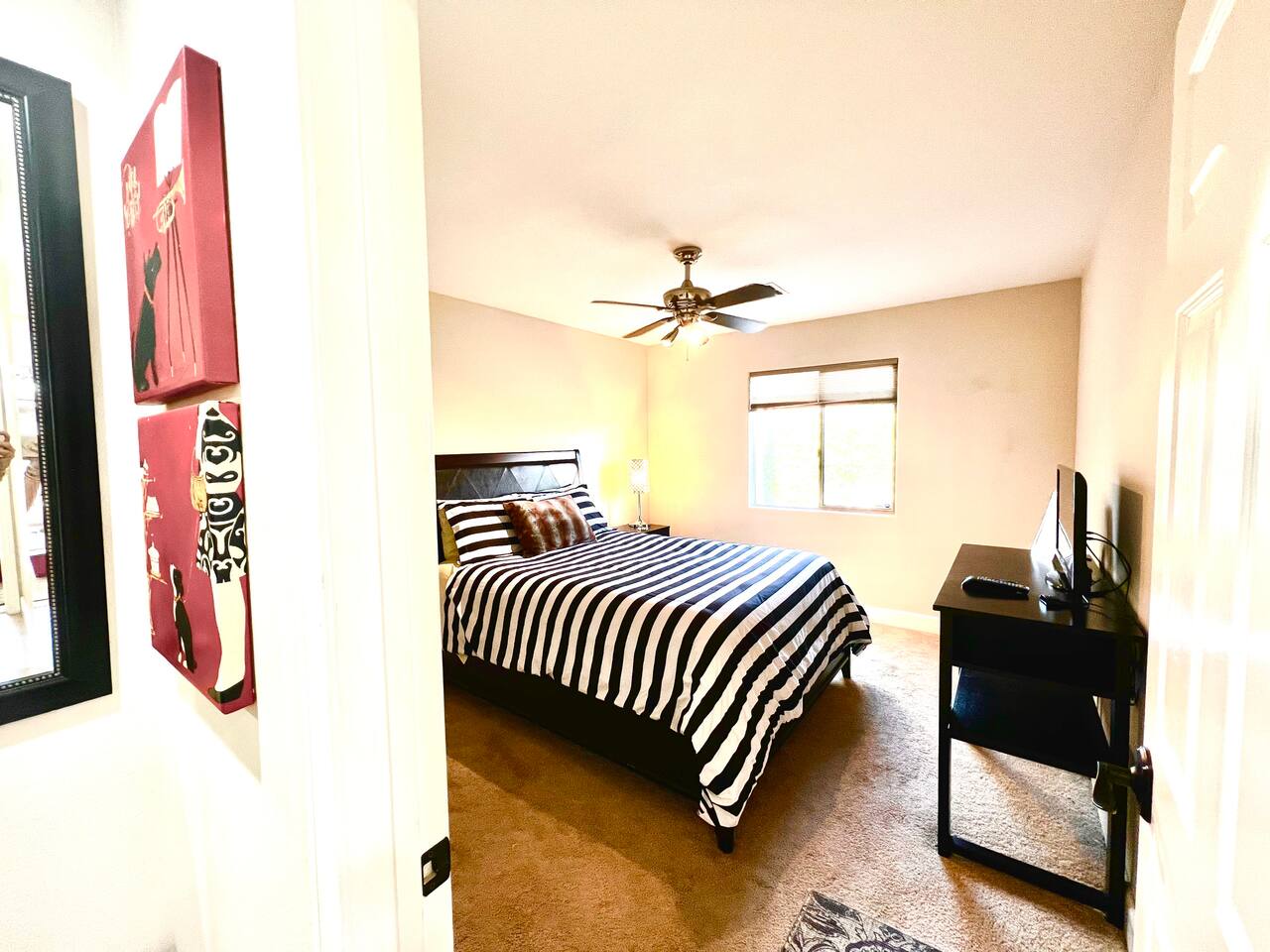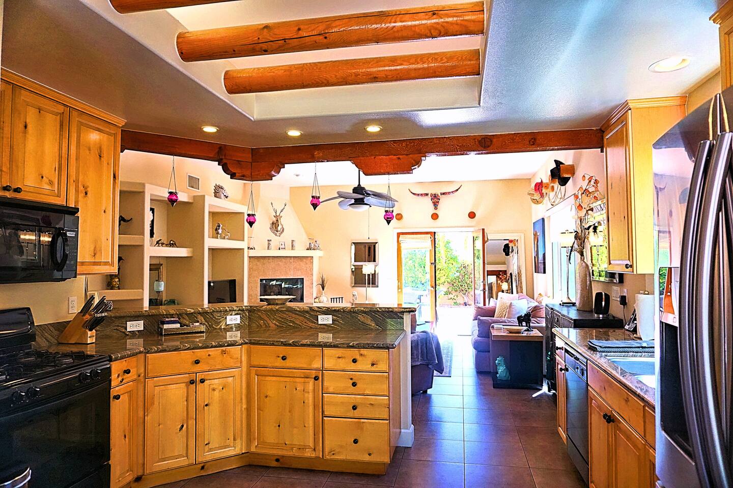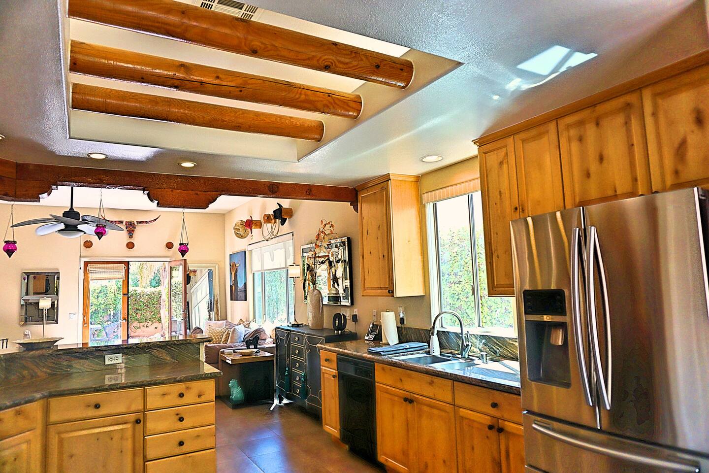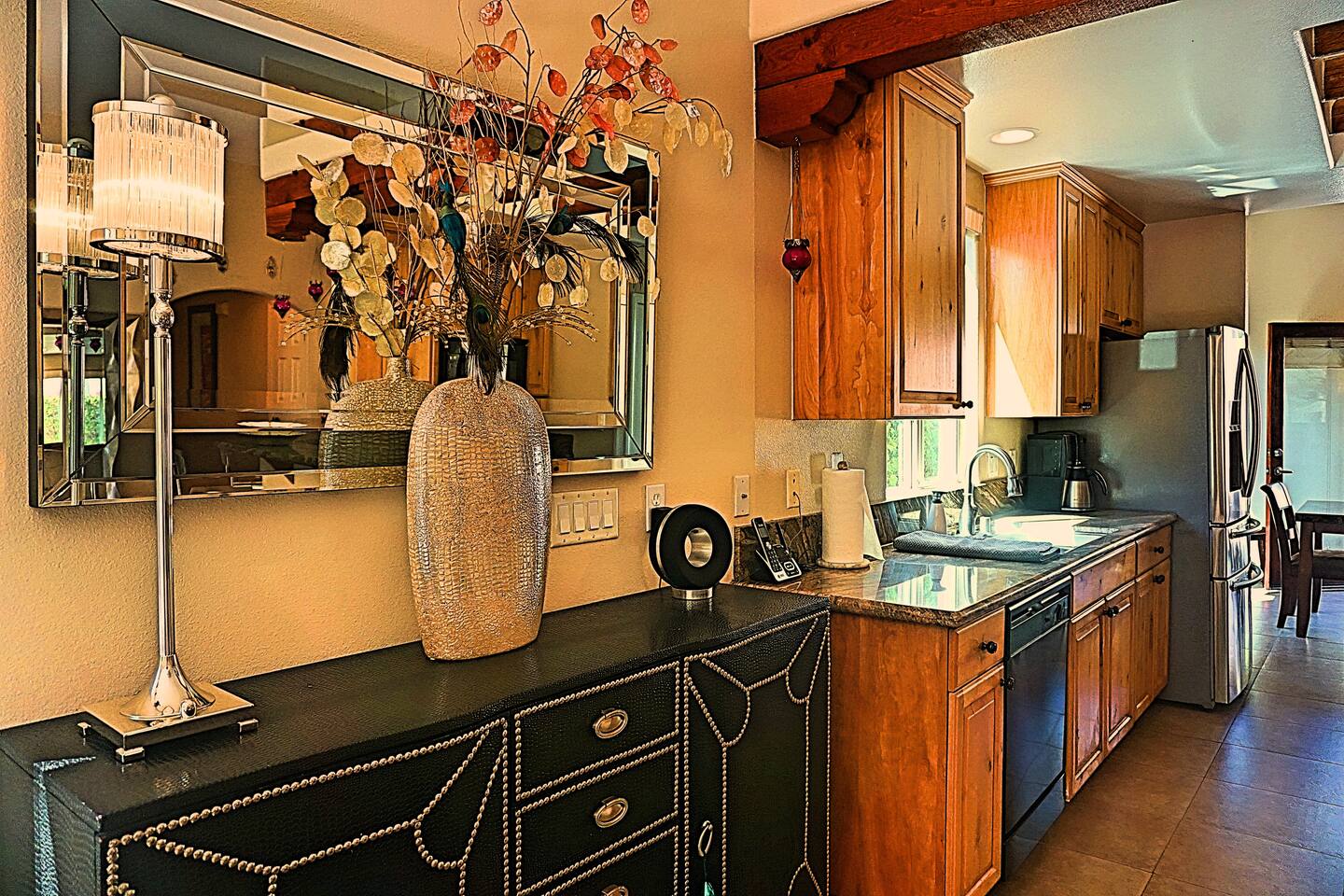 * PRIVATE pebble tech Pool and Spa with waterfall * The entire property is fully walled and safe for Pet lovers * For babies, we offer a highchair, a crib, a baby stroller, and a sitting play roller * Secure, fast Wi-Fi speeds. * We offer Netflix, Hulu, Apple TV, HBOMax, Starz, YouTube, and Sling Live TV. * Elegant Living Room 50" TV with Roku * Large Primary Bedroom 55" TV with Roku * 2nd bedroom 50" TV with Roku * 2 Patios, one with an outdoor table and chairs fitting six, and the other patio with two lounge chairs * Hiking/Biking Trails close by * Village walking distance * Public Tennis Courts close by * Barbecue gas * 2 Lounge chairs + umbrella * For babies, we offer a highchair, a crib, a baby stroller, and a sitting play roller Smooth, welcoming SINGLE LEVEL Santa Fe 1,800 sqft POOL/SPA Villa with stunning Mountain Views located in the renowned La Quinta Cove, just minutes from the famous La Quinta Spa Resort. Enjoy the PRIVATE Pebble Tech Pool/Spa with a relaxing waterfall and marvel at the countless stars at night. Pet-friendly property! Fully gated yard! Close to numerous hiking and biking trails and "Old Town La Quinta." The open living room features a cozy fireplace and direct access to the back patio. It includes a smart LG 4K TV 50 BBQ on the PATIO area, outdoor dining table fitting six people 12 FEET CEILINGS in the Living Room with recessed lights on dimmers and a cozy fireplace. Direct admission to the patio from the living room. French doors also lead from the dining room to the fully walled pool and the front patio. The kitchen is open to the living room and has a bar, a stainless steel SAMSUNG refrigerator, and filtered water. This fully stocked kitchen features a toaster, microwave, dishwasher, garbage disposal, a coffee maker (regular and Keurig), and more. Extensive PRIMARY BEDROOM SUITE with a full en-suite bathroom, king-size bed, and generous walk-in closet. Its 10 ft ceilings and French doors traversing to the back patio offer comprehensive privacy and indulgence. Two further peaceful bedrooms, each with a plush queen bed and walk-in closets. Whether it is diversion or business that brings you to La Quinta, you will want to strike a round of GOLF at one of the many great golf courses, go HIKING, play TENNIS (courts just 5 minutes away, and for FREE), fancy a day of SHOPPING on 'El Paseo' or spoil yourself at one of the FULL-SERVICE SPAS as the classy historical 'LA QUINTA Resort and Club WALDORF ASTORIA. The best place to get your coffee or breakfast in the morning is 'THE OLD TOWN' in La Quinta, which is just 2 minutes by car or 15-20 minutes on foot. This palliative home offers all the comfort and support you need to pause your agenda and connect with family or friends. We love the freedom of opening the gate, exercising our dogs on the nearby trails in the Cove, and relishing the endless refinement and recreation of the desert. We cannot wait to treat you as you deserve, regal treatment.
