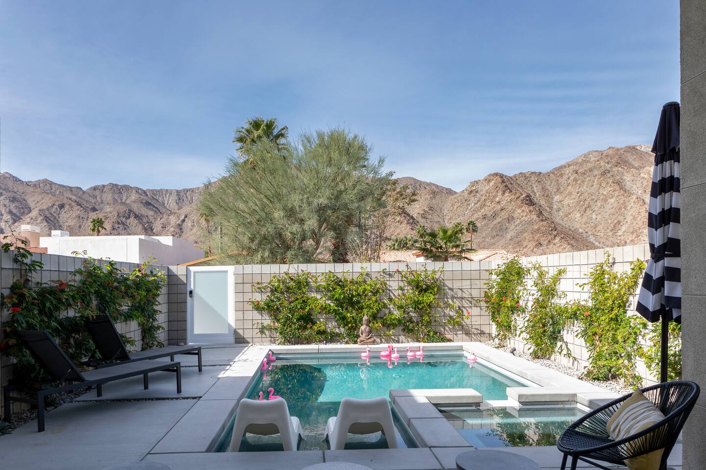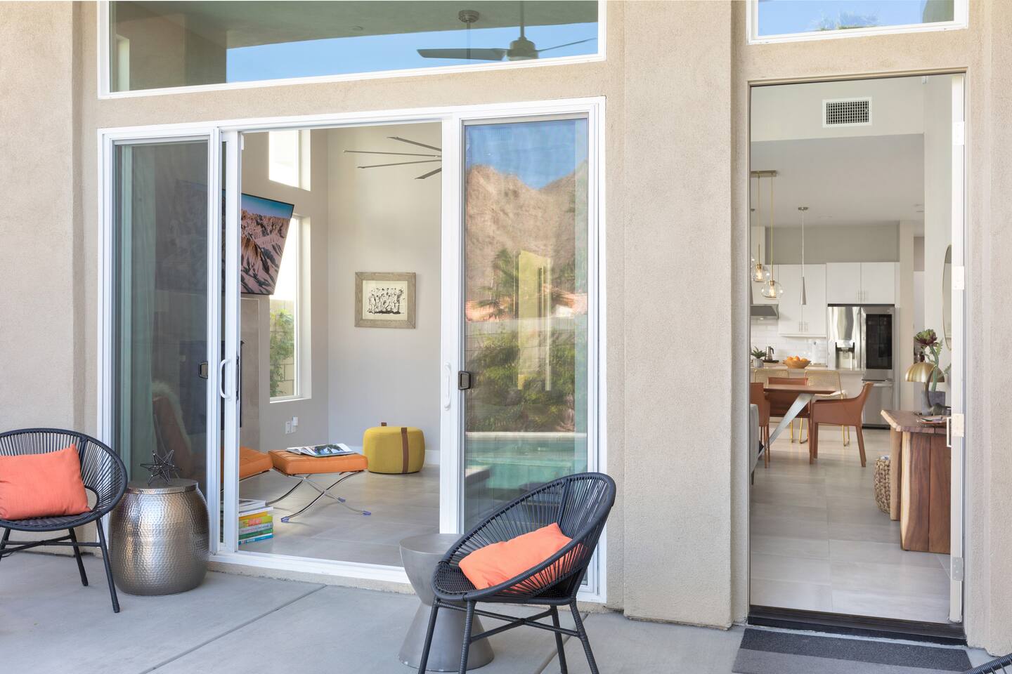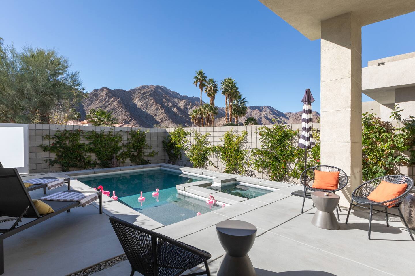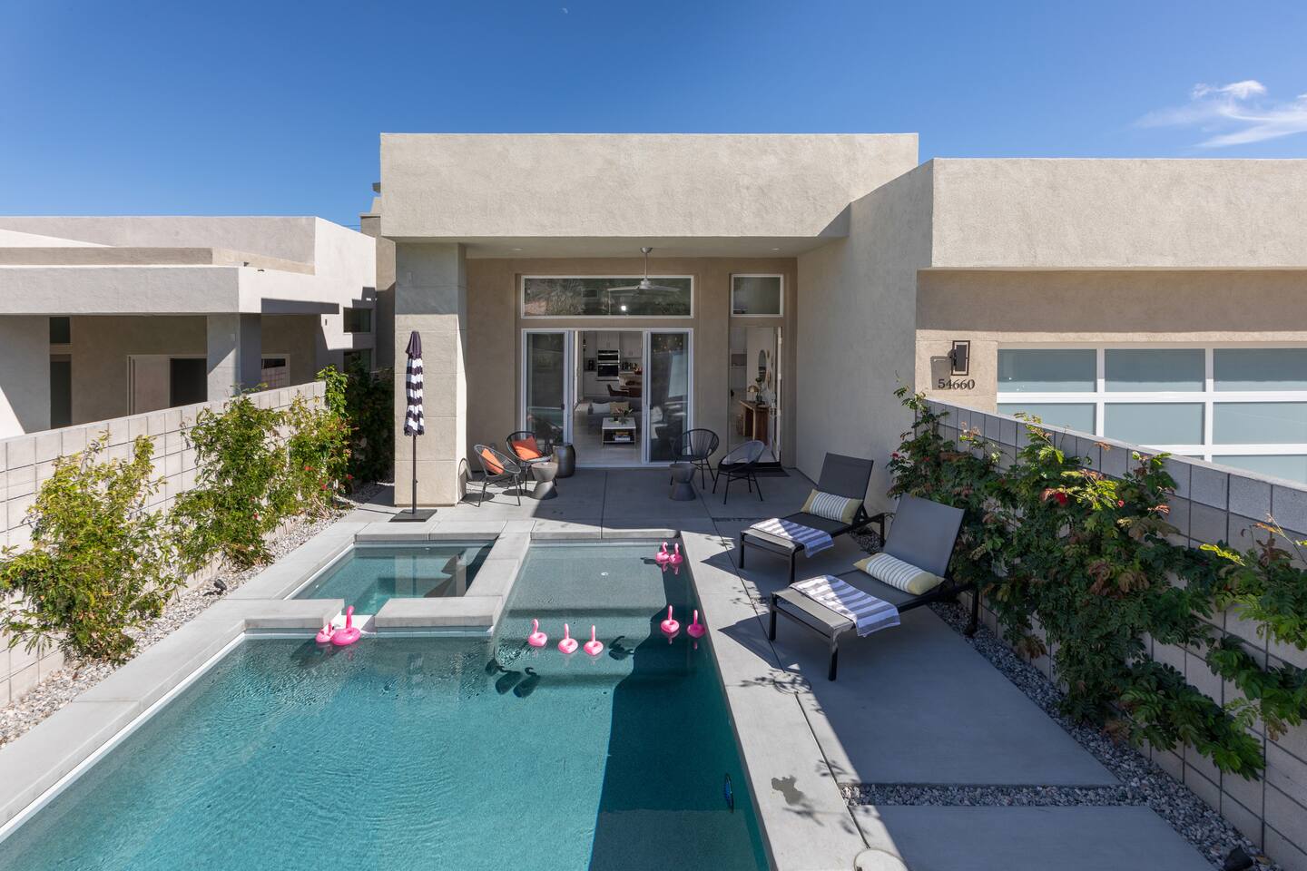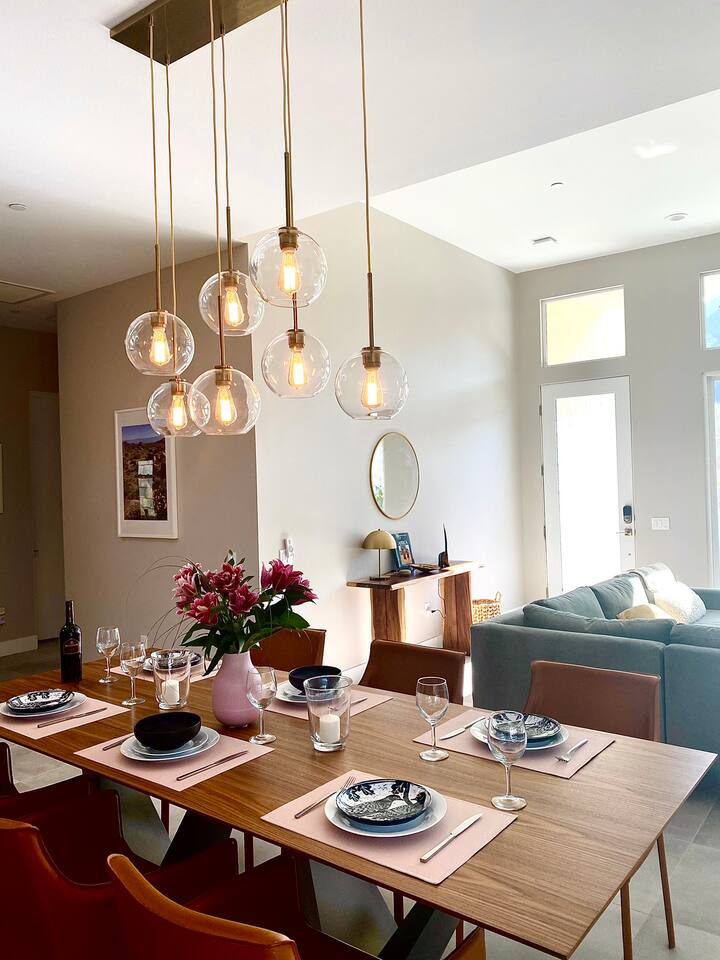 Come to La Quinta and have the best stay of your life. In an amazing newly constructed light filled luxury home, that feels like a home! This is the house that when you are driving up looking at the addresses, you hope that this is the house your rented. Well it is! This contemporary luxury 3-bedroom 2 ½ bath pool home lies at the top of La Quinta Cove, where you are steps away from the most amazing hiking and biking trials in Coachella Valley. The mountain views from the jacuzzi are breath taking and in the night sky you can see so many stars that the milky way is actually milky. It has the perfect jacuzzi and heated pool to play in so don’t forget your sunscreen and beach ball! It has a fully equipped kitchen with a cozy island to congregate around while cooking. Quaint comfortable Indoor and outdoor seating areas. Once you are there you will not want to leave! Check out our reviews! It is said that High ceilings increase your creativity and out-of-the-box-thinking. Stay here and let your creative juices flow! #Coachella #Stagecoach #BNPParibasOpen #IndianWellsTennis #IndianWells #PalmSprings